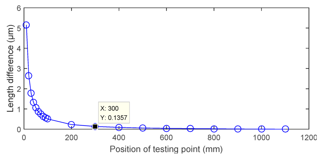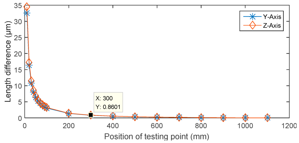 The simulation results for length difference in different measuring lengths are shown in Figure 12 and Figure 13. In this simulation, we let Δx, Δy and Δz, respectively, be 0.7978, 0.2715 and 0.1965 mm (these values have no any meaning and are not very important, we just use these values to perform the evaluation), in which the measurement length differences in y- and z-axis are computed by:
