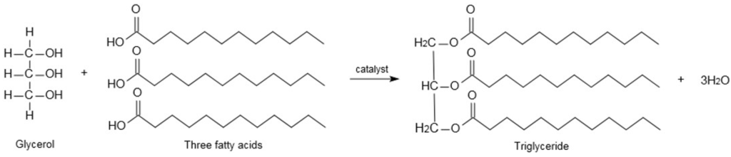 Chemical formation of triglyceride by esterification of glycerol with fatty acids.
