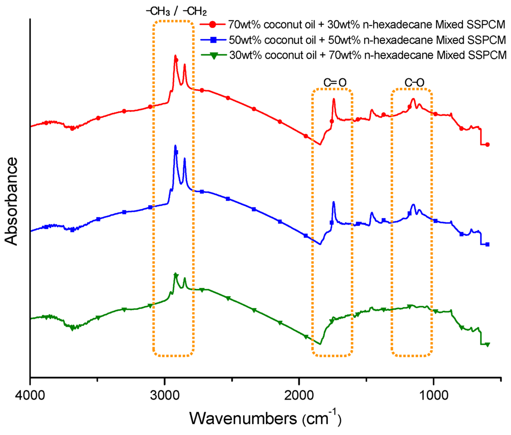 Most of the edible oils, including coconut oil, are composed of triglycerides. As shown in Figure 2, a triglyceride is a fatty acid ester formed by esterifing glycerol with three fatty acids. Coconut oil consists of medium-chain triglycerides (MCTs), which are triglycerides that possess 8 to 12 carbons of fatty acids. So the coconut oil contains –CH3, –CH2, C=O, and C–O bonding. As shown in Figure 3, the FT-IR absorption spectrum of the Mixed SSPCMs appears with nearly the same absorption peaks. There are absorption peaks of 2919–2920 cm−1 and 2850–2851 cm−1 occurred by –CH3 and –CH2 bonding, and 1735–1744 cm−1 and 1149–1160 cm−1 occurred by C=O, and C–O bonding of ester groups. However, the 30 wt % coconut oil + 70 wt % n-hexadecane Mixed SSPCM that contains a small percentage of coconut oil gives rise to small peaks in C=O, and C–O bonding of ester groups. The n-hexadecane is a paraffin PCM that is consists of 16 carbons and 34 hydrogens of single chain. The condensed structure formula of that is CH3(CH2)14CH3. So the n-hexadecane also generate the peaks of –CH3 and –CH2 bonding. The FT-IR absorption peaks of the Mixed SSPCMs are shown in Table 3.