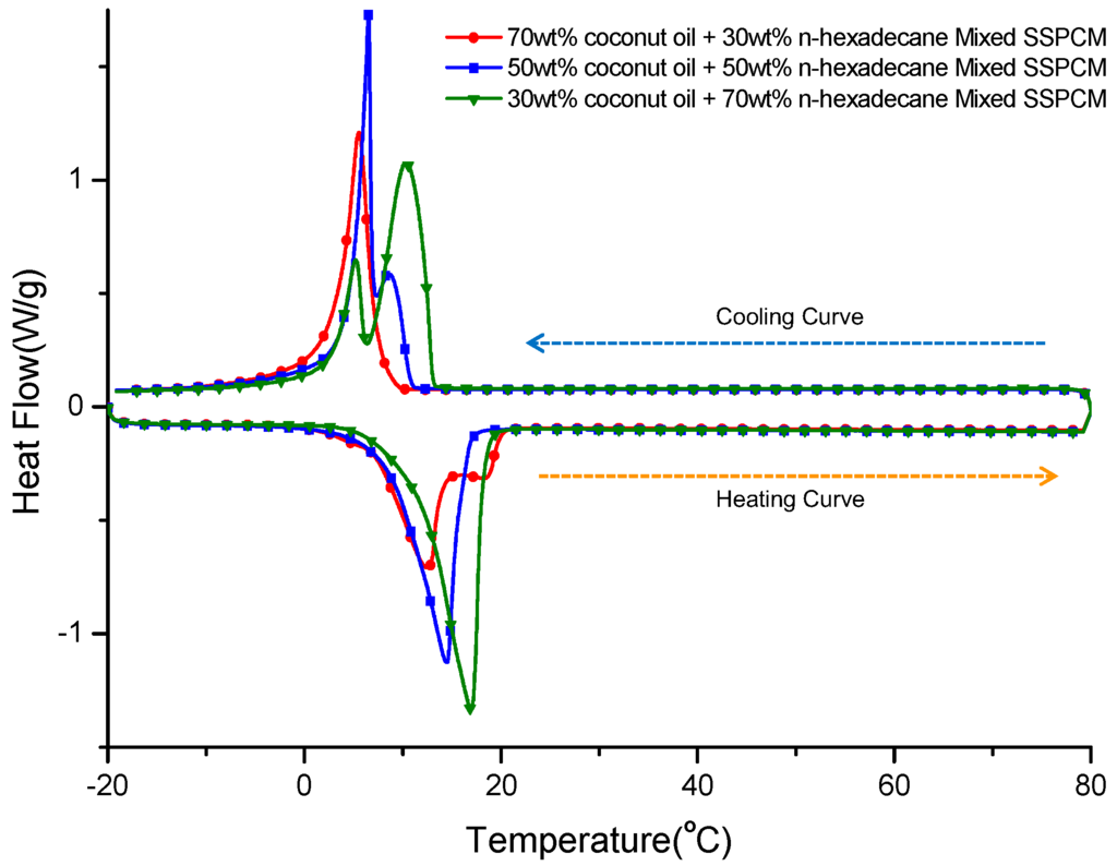 Figure 4 shows the heating and freezing curves from DSC measurements of the coconut oil + n-hexadecane Mixed SSPCMs. Table 4 represents the phase transition temperature and latent heat capacity of coconut oil + n-hexadecane Mixed SSPCMs and Table 5 represents those of coconut oil/xGnP and n-hexadecane/xGnP SSPCMs. As shown in Figure 4, the phase transition of the Mixed SSPCMs during heating and melting occurred at the lower temperature of the each melting and freezing point of the coconut oil and n-hexadecane. The Mixed SSPCMs display a tendency that the more the Mixed SSPCM contains a high rate of n-hexadecane, the greater the melting and freezing points. The melting temperatures at peak points of the Mixed SSPCMs were 12.53 °C, 14.51 °C, and 16.92 °C, while the freezing temperatures at peak points of them were 5.55 °C, 6.54 °C, and 10.31 °C. The difference between melting and freezing points of the Mixed SSPCMs is because of supercooling of PCMs.
