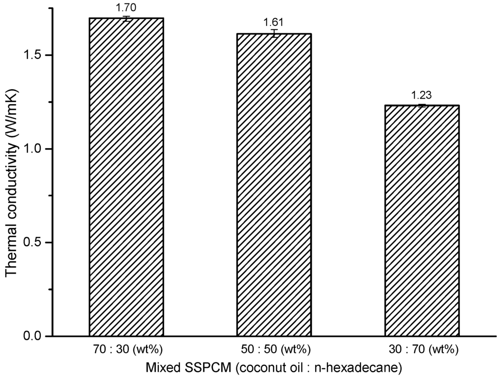 The thermal conductivity analysis of the coconut oil + n-hexadecane Mixed SSPCMs using TCi at the temperature of 10 °C is shown in Figure 6. As shown in Figure 6, the thermal conductivities of the Mixed SSPCMs are 1.70, 1.61, and 1.23 W/mK. The Mixed SSPCMs appear to follow the tendency that the more coconut oil they contain, the greater the thermal conductivity because the pure coconut oil has larger thermal conductivity than pure n-hexadecane. The thermal conductivities of pure coconut oil and n-hexadecane are 0.321 and 0.154 W/mK, respectively [23,24]. The overall Mixed SSPCMs have larger thermal conductivities which are 284% higher than the pure PCMs. This implies that the xGnP led to an enhancement of the thermal conductivity of coconut oil and n-hexadecane. Consequently, we concluded that Mixed SSPCMs can be usefully applied to various categories such as buildings.
