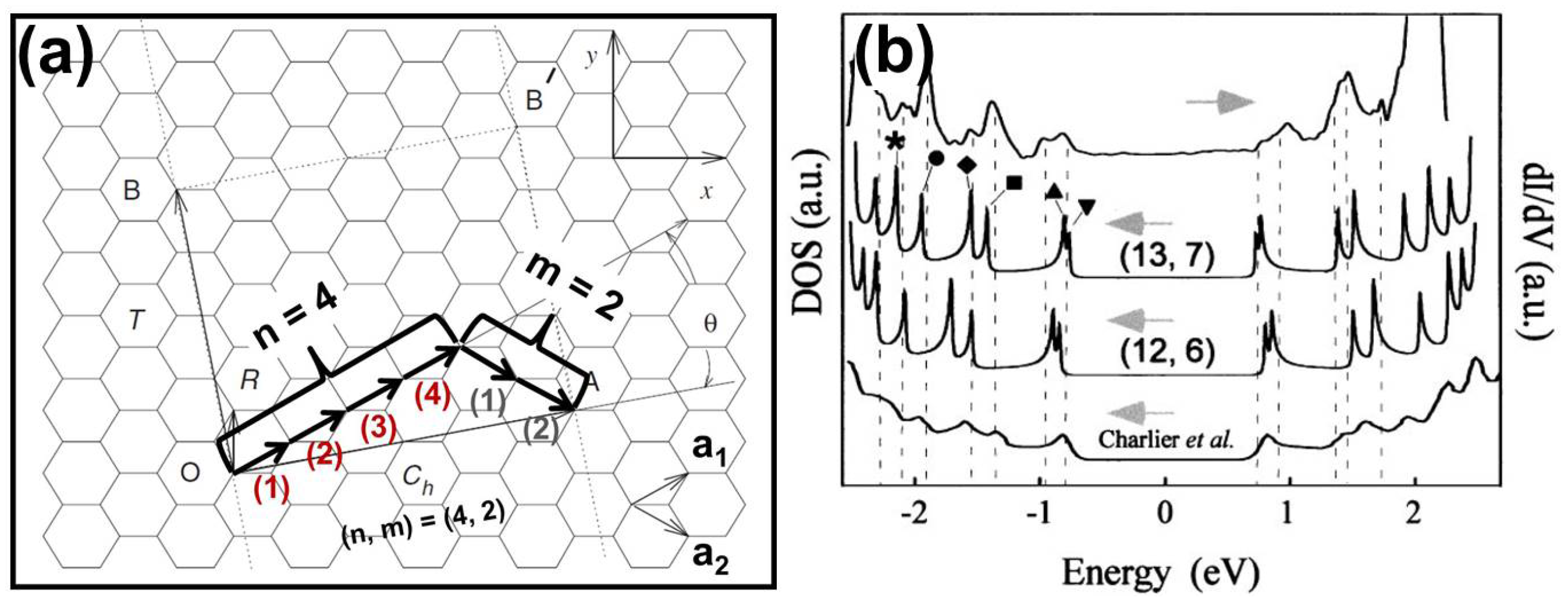 (a) Illustration of the graphene lattice, which serves as a template for carbon nanotube construction. The vectors and are the basis vectors of graphene in direct space. As illustrated, by displacing the lattice vector n times in the direction and m times in the direction, the chiral vector is formed, which together with the orthogonal vector forms the unit cell of the carbon nanotube. The indices of the chiral vector () define the indices of the carbon nanotube. Namely, the rectangle AOBB’ is the unit cell in real space for the () tube, in which one chiral vector component is displaced four times in the direction and two times in the direction. The stripe formed (see dotted lines), which has a length equal to the size of , forms the carbon nanotube when it is rolled up. Figure adapted with permission from [4], Copyright Elsevier, 2006. (b) Van Hove singularities (VHS) obtained from scanning tunneling microscopy (STM) measurement, as shown in the upper curve, and theoretical calculations of the VHS for the and the carbon nanotubes. The vertical dashed lines indicate the VHS in the experimental curve. Reproduced with permission from [11], Copyright American Physical Society, 1999.