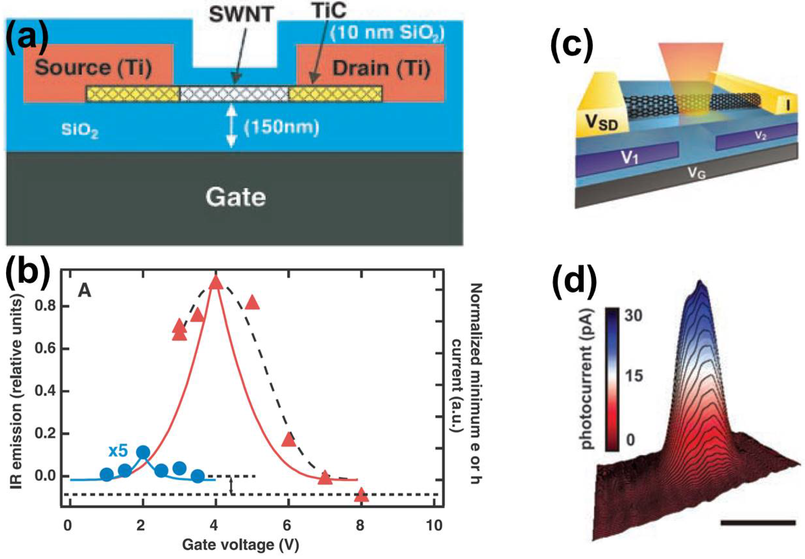 (a) Schematic drawing of an ambipolar semiconducting single-walled carbon nanotube (SWNT) device and (b) infrared emission intensity during repeated sweeps of the drain potential as a function of gate voltage. Reproduced with permission form [12], Copyright The American Association for the Advancement of Science, 2003. (c) Schematic of a typical split-gate device for photocurrent generation under focused optical illumination and (d) a spatially-resolved photocurrent two-dimensional map with a continuous laser excitation emitting at the wavelength 532 nm and optical power density 25 W/cm for a device of diameter d = 1.8 nm. Scale bar, 1 mm. Reproduced with permission from [15], Copyright The American Association for the Advancement of Science, 2009.