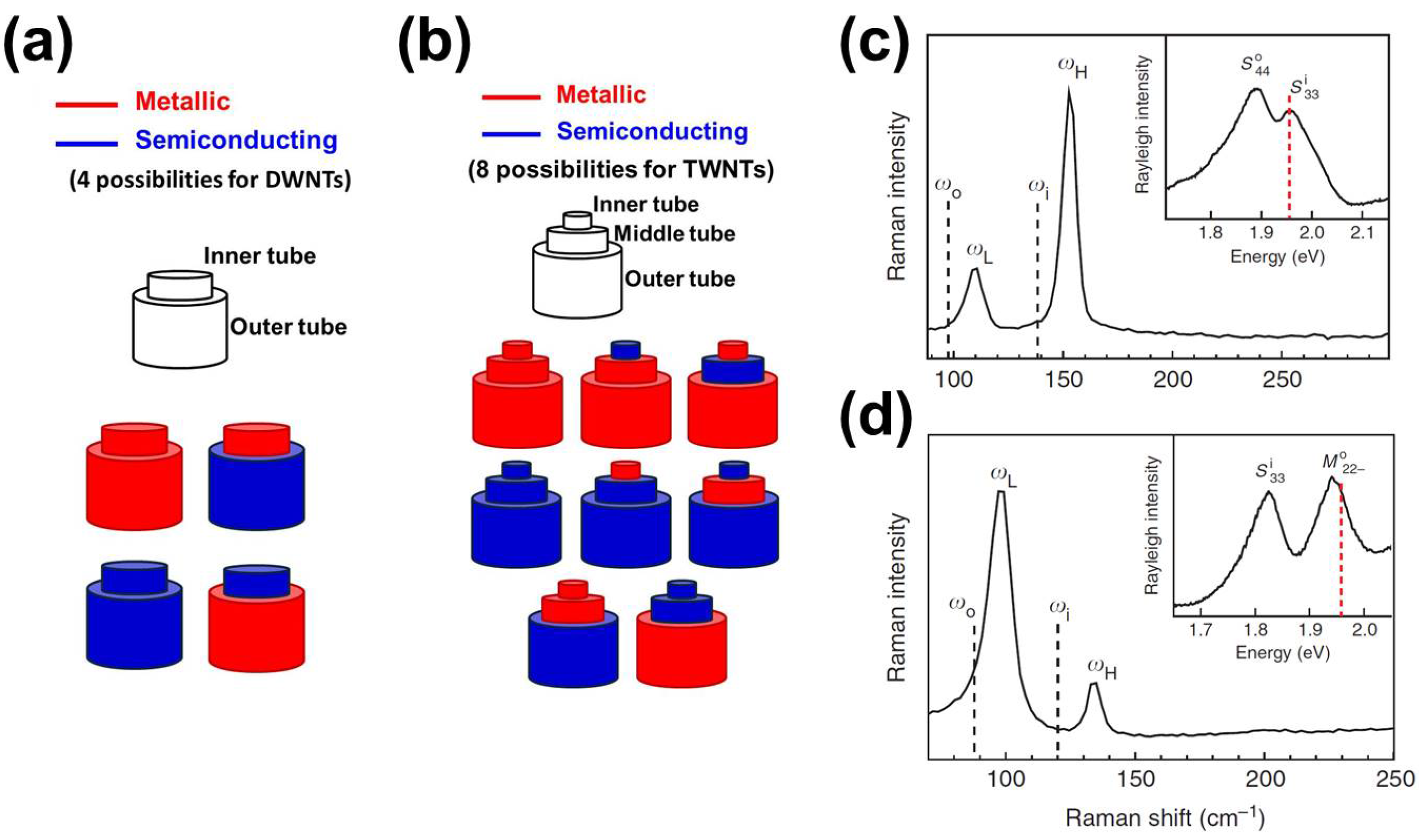 Illustration of the possible flavors or metallicities to be obtained for (a) double-walled carbon nanotubes and (b) triple-walled carbon nanotubes. (c) The Raman spectrum of a @ double-walled carbon nanotube (DWNT) and (d) the Raman spectrum of a @ DWNT. Both spectra show a strong blueshift in the radial breathing mode (RBM) frequencies from those SWNTs constituting the DWNTs (shown by the dashed lines). The insets in (c) and (d) show the Rayleigh spectra for the respective DWNTs. Reproduced with permission from [56], Copyright Nature Publishing Group, 2013.
