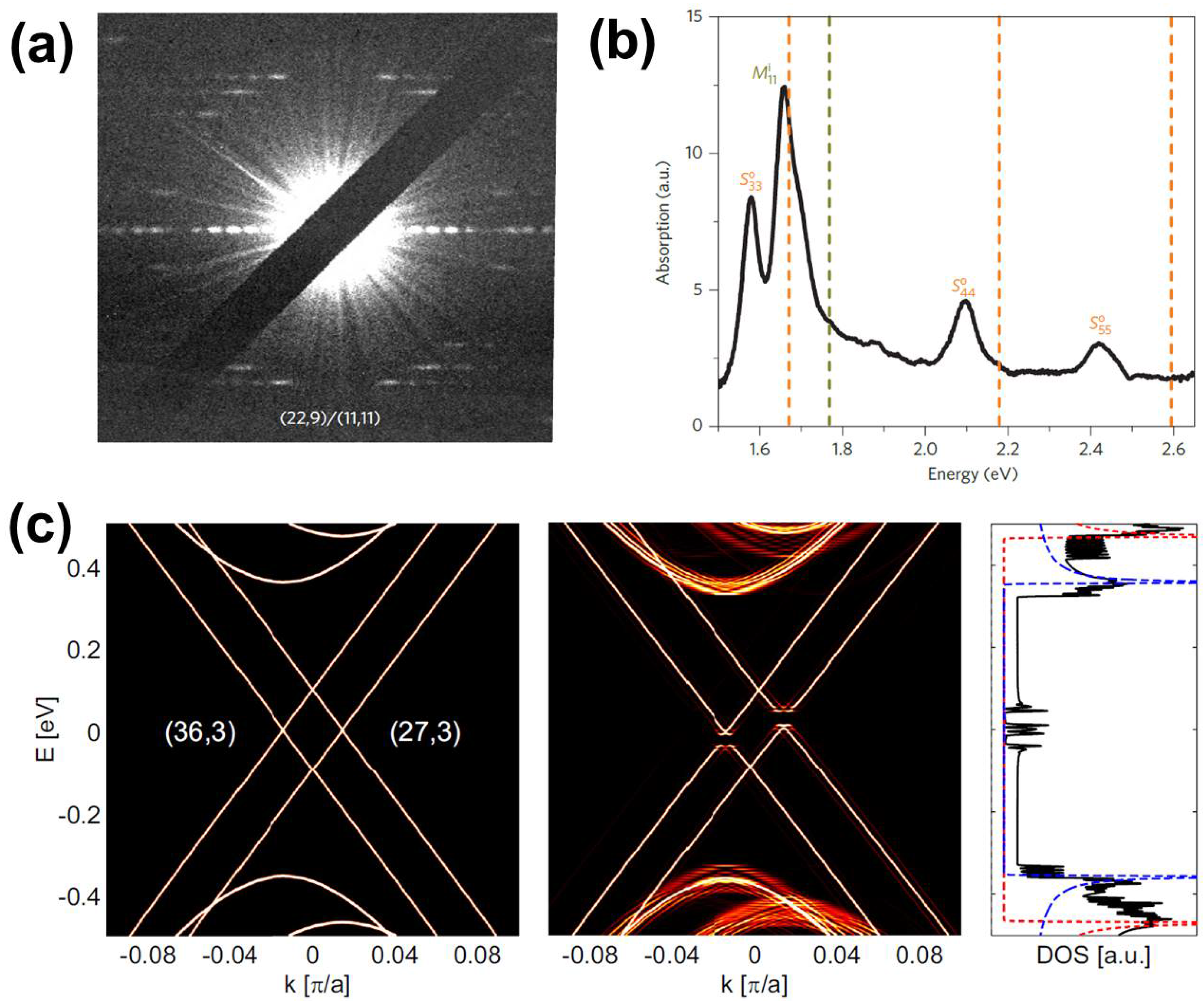 (a,b) The electron diffraction pattern of a @ DWNT and the absorption spectrum of the same DWNT, respectively. The dashed lines in (b) show the expected emission for the constituting SWNTs, and when compared to the experimental data, it is evident that the DWNT emissions are all redshifted. Reproduced with permission from [55], Copyright Nature Publishing Group, 2014. (c) Theoretical calculations showing the energy bands for a @ DWNT that presents Moir patterns. The left panel shows the energy bands for each constituent SWNT without the influence of interlayer (IL) interactions. The middle panel shows the changes in the energy bands when the IL interactions are present. The right panel shows the DWNT density of states (DOS). The dotted red (blue) lines are DOS for inner (outer) nanotubes and the solid black line is the DOS for the coupled DWNT. Reproduced with permission from [54], Copyright American Physical Society, 2015.