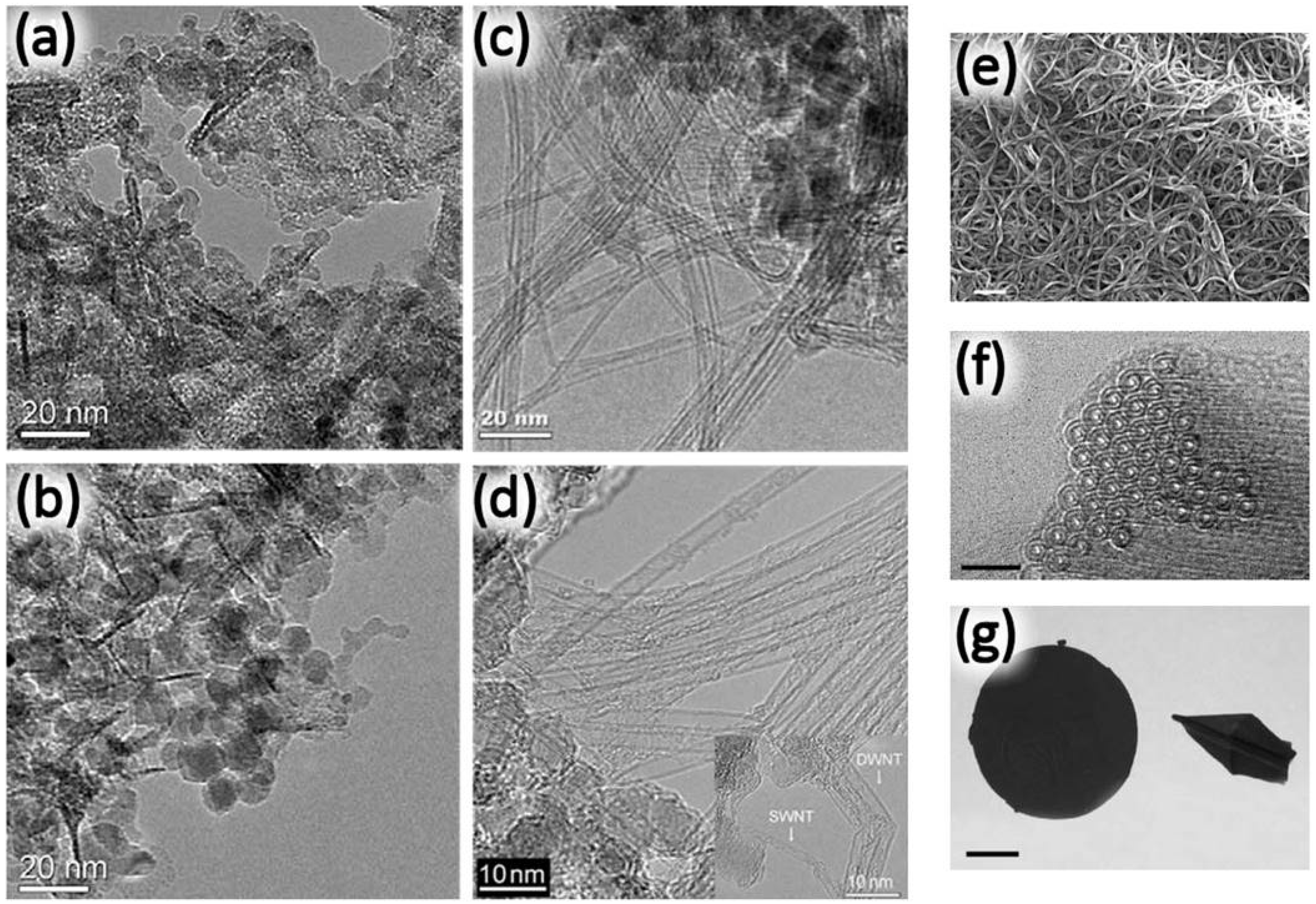 Various methods for DWNT synthesis and layer number control. (a)–(d) DWNTs from diameter-controlled Fe nanoparticles supported on MgO. Reproduced with permission from [100], Copyright Elsevier, 2004. Transmission electron microscopy (TEM) images of (a) 4-nm and (b) 10-nm Fe nanoparticles on MgO and (c) small and (d) large diameter DWNTs from diameter-controlled Fe nanoparticles (a) and (b), respectively. Highly bundled DWNTs grown from Fe/MgO with Mo/AlO conditioning catalysts: (e) Scanning Electron Microscopy (SEM) image, (f) TEM image and (g) optical image of flat and origami structured buckypaper. Reproduced with permission from [104], Copyright Nature Publishing Group, 2005.