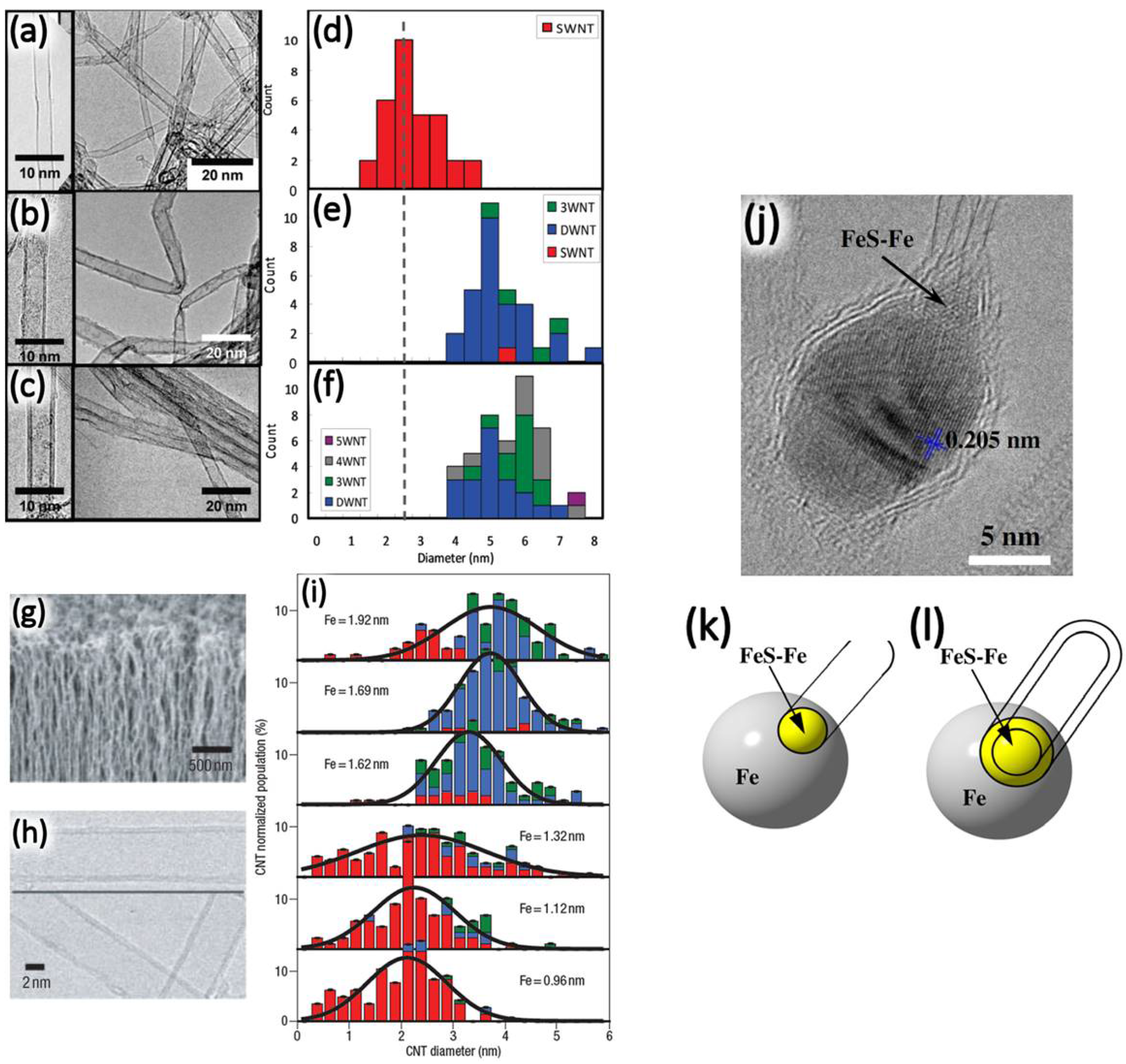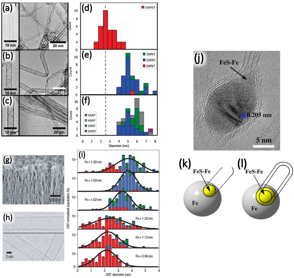 (a)–(f) Layer number control of CNTs by introducing a reaction enhancer. Reproduced with permission from [115], Copyright American Chemical Society, 2009. TEM images and histograms show selective growth of SWNTs (a)–(d), DWNTs (b)–(e) and MWNTs (c)–(f), in the case of water, methyl-benzoate and benzaldehyde used as a reaction enhancer, respectively. (g)–(i) Vertically-aligned DWNTs grown from a thickness-controlled Fe film. Reproduced with permission from [116], Copyright Nature Publishing Group, 2006. (g) SEM image, (h) TEM image and (i) wall number and diameter distributions of CNTs for various Fe film thicknesses. (j)–(l) Layer number controlled by sulfur addition. Reproduced with permission from [120], Copyright Elsevier, 2007. TEM image of a SWNT nucleating from Fe nanoparticles with the area activated by FeS-Fe eutectic formation (j), and the proposed growth model for (k) SWNTs and (l) DWNTs by sulfur addition.