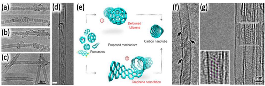 Lim et al. [137] found that there are two different intermediate states of the inner tube depending on the encapsulated molecular species. In the case of PTCDA, graphene nanoribbon-like intermediates were formed during annealing (Figure 7d), whereas fullerenes, picene and pentacene formed deformed fullerene-like intermediates prior to DWNT formation (Figure 7e). The graphene nanoribbon-like intermediates are possible because the oxygen-terminated edges of PTCDA molecules release their oxygen, to generate CO or CO molecules upon annealing, and the remaining perylene tetraradicals are merged into the graphene nanoribbon structure. The helically-twisted single or double graphene nanoribbons are further merged into an inner tube upon continuous annealing. Ferrocene (FeCp), which is commonly used for CNT growth as a metal catalyst precursor for the catalytic chemical vapor deposition (CCVD) floating catalyst method, also works as a precursor for the inner tube growth [139,140,141]. In the case of ferrocene, the inner tube formed at a low temperature of 600 C [139]. It was proposed that the formation mechanism of the inner tube is different from the fullerene coalescence and graphene nanoribbon merging methods, since these coalescence-derived inner tube formation methods do not occur at this low temperature. The encapsulated ferrocene (Figure 7f) would first decompose into iron carbide (FeC, Figure 7g), which could be responsible for the catalytic growth of these inner tubes.