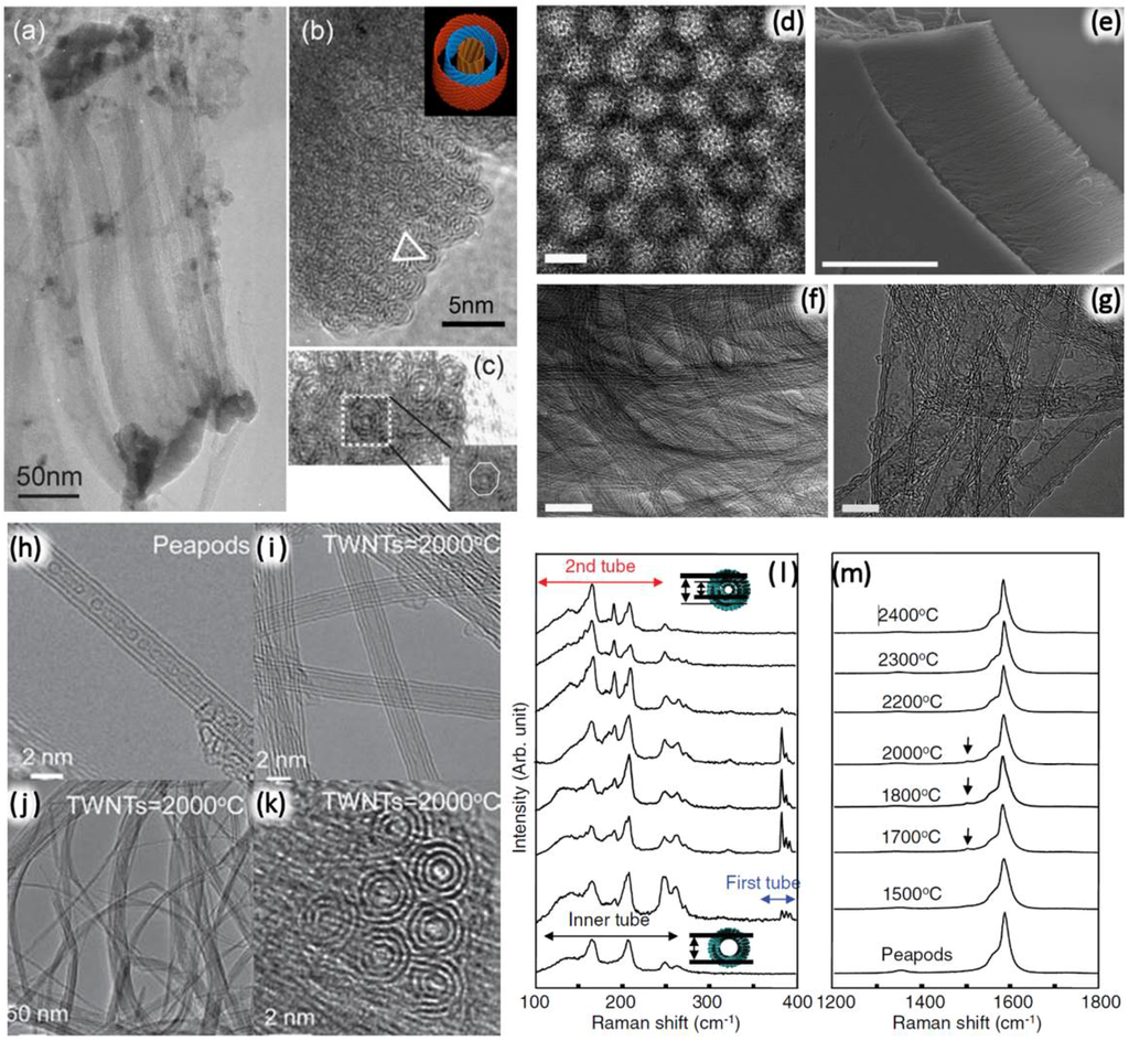 Muramatsu et al. prepared high quality TWNTs by introducing C into DWNTs followed by high temperature annealing [149,150] and starting from CCVD-prepared high quality DWNTs [104]. In order to enlarge the DWNT diameters, high temperature annealing was carried out prior to C encapsulation [149]. At a temperature of 2400 C, the diameter of both the inner tube and the outer tube of the DWNT increased via the coalescence mechanism [149]. After the annealing process, the inner tube diameter of the DWNT was in the range of 1.0–1.8 nm, which is wide enough for C encapsulation. The DWNT and C were sealed inside a glass ampoule under vacuum, and then, the glass ampoule was heated at 600 C for the C encapsulation. Finally, a secondary high temperature heat treatment process (1500 °C–2000 C) transformed the DWNT-pea pod (Figure 8h) into TWNTs (Figure 8i–k) [149]. The diameter of the newly-generated inner-most tube was in the range of 0.4–1.0 nm, and the generation of an inner-most tube was confirmed by Raman spectroscopy (Figure 8l–m). Recently, Hirschmann et al. [57,58,59] used resonant Raman spectroscopy (RRS) to study in greater detail these fullerene-derived TWNTs in both bundles and isolated versions. In these studies, the authors confirmed the high-quality TWNT throughput of the fullerene-derived method reported by Muramatsu and co-authors [149]. The works by Hirschmann and co-authors also reported the first comprehensive studies on the vibrational properties of these high-quality TWNTs, connecting such properties with their SWNT and DWNT counterparts [57,58,59,151,152,153]. Table 2 summarizes the different synthesis conditions that produce TWNTs.