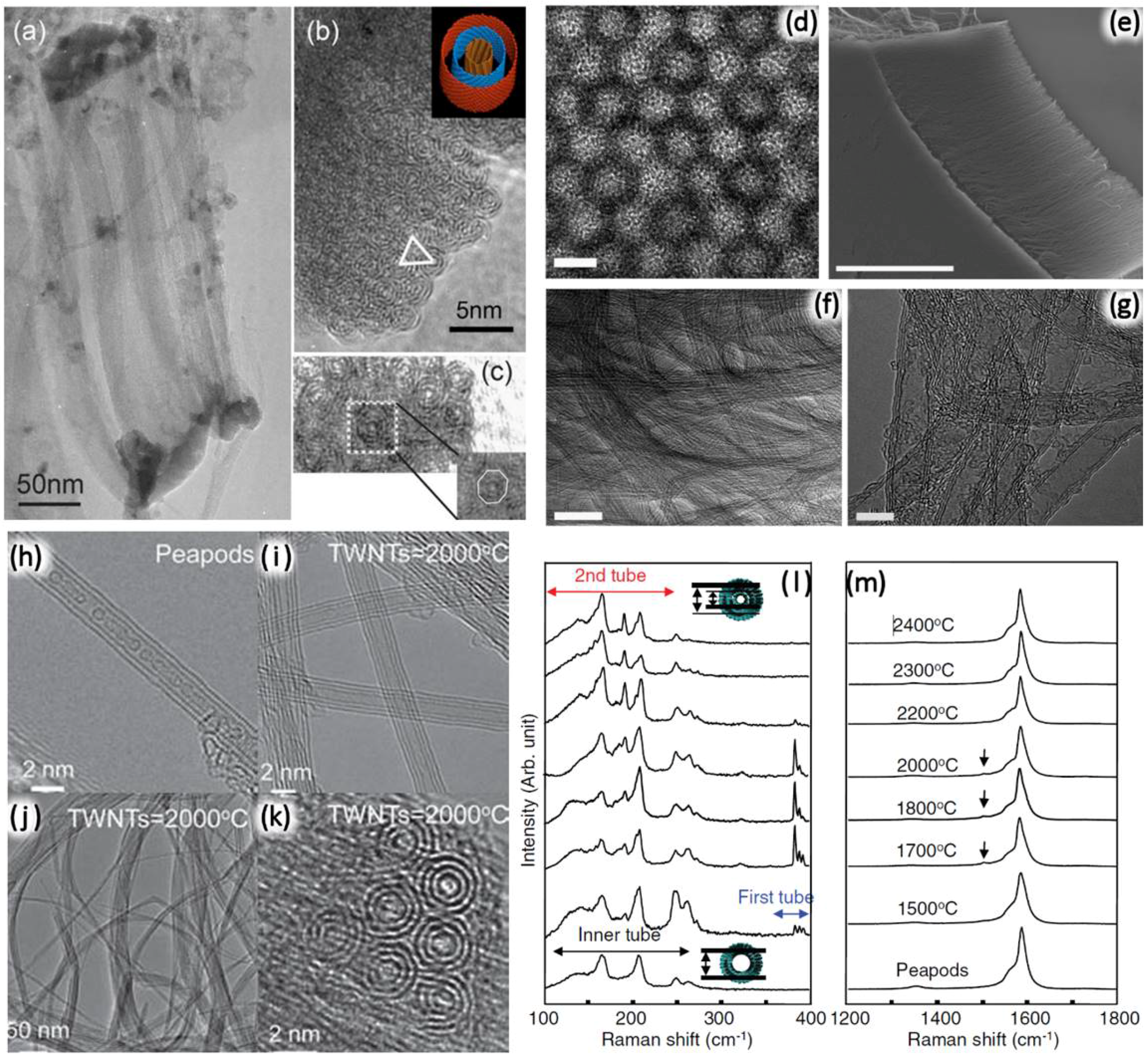 Synthesis of triple-walled carbon nanotubes (TWNTs) using various methods. Catalytic chemical vapor deposition (CCVD)-synthesized TWNT ring. Reproduced with permission from [144], Copyright AIP Publishing LLC, 2006. Low (a) and high (b) magnification TEM image of a TWNT ring. TWNTs are packed into a triangular configuration (b) and faceted TWNTs within the ring (c). Vertically-aligned TWNT grown from engineered hollow nanoparticles (HNPs) by plasma-enhanced CVD (PECVD); (d) hollow nanoparticles used as a catalyst; the scale bar represents 5 nm ; (e) SEM image of vertically-aligned TWNTs; the scale bar represents 10 nm; (f) low and (g) high magnification TEM images of TWNTs; the scale bars represent 50 and 5 nm, respectively. Reproduced with permission from [147], Copyright American Chemical Society, 2014. DWNT pea pod-derived TWNTs; TEM images (h)–(k) and Raman spectrum (l)–(m). Reproduced with permission from [149], Copyright John Wiley and Sons, 2011. High magnification image of C-encapsulated DWNTs (h) and TWNTs formed by high temperature annealing at 2000 C (i). The generation of peaks at 380 cm in (l) confirms the formation of the inner most tube of TWNTs by annealing over 1500 C, especially between 1700 ° C and 2000 C (m) [149,150].