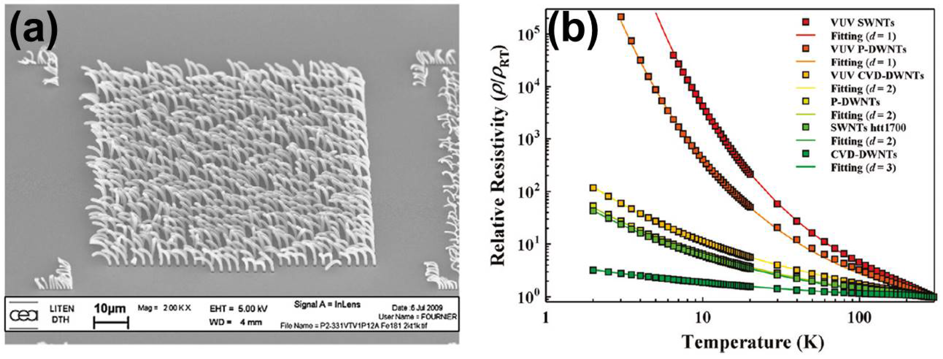 (a) The selective growth of DWNTs and TWNTs is achieved on doped silicon via TiN structures in specific regions over the surface. (b) Relative resistance as a function of temperature for the SWNT, pea pod-derived and CVD-DWNT films before and after vacuum ultraviolet treatment. It is observed that the ultraviolet (UV) treatment largely increases the relative resistance of the films. Reproduced with permission from [158], Copyright American Chemical Society, 2011.