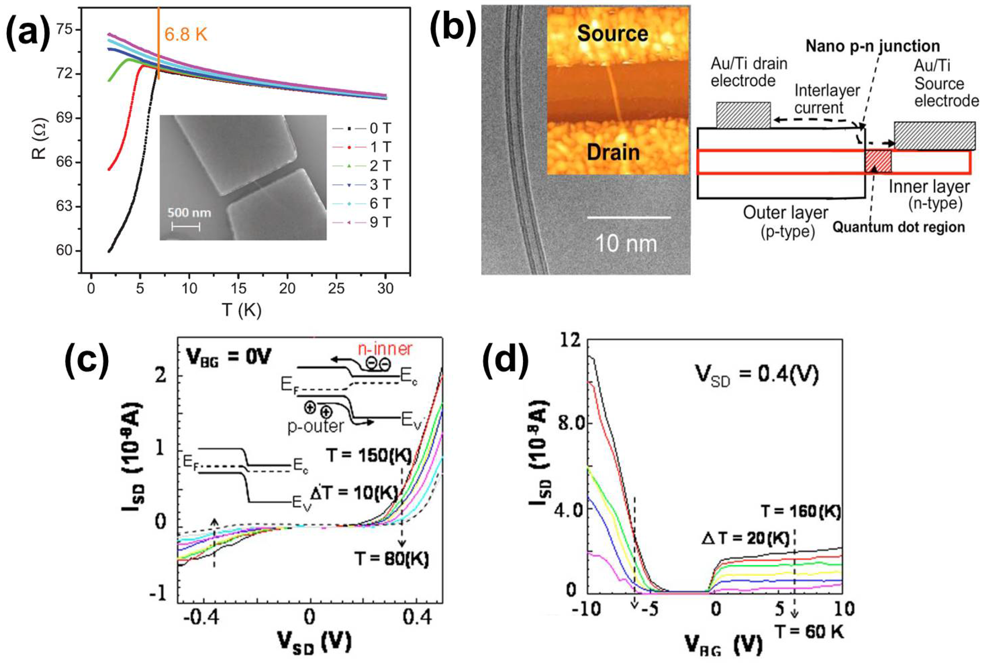 (a) Resistance as a function of temperature at various magnetic fields B. There is a steep drop in the resistance for temperatures below the critical temperature of 6.8 K. Reproduced with permission from [28], Copyright Nature Publishing Group, 2012. (b) The left panel shows the transmission electron microscopy (TEM) image of a DWNT. The inset shows the DWNT between the source (S) and drain (D) electrodes. The right panel shows the design of the nano-p-n junction device. Reproduced with permission from [163], Copyright AIP Publishing LLC, 2009. (c,d) The source-drain current plotted against the source-drain voltage and the back-gate voltage, respectively. The asymmetric ambipolar behavior is observed in both plots. Reproduced with permission from [163], Copyright AIP Publishing LLC, 2009.