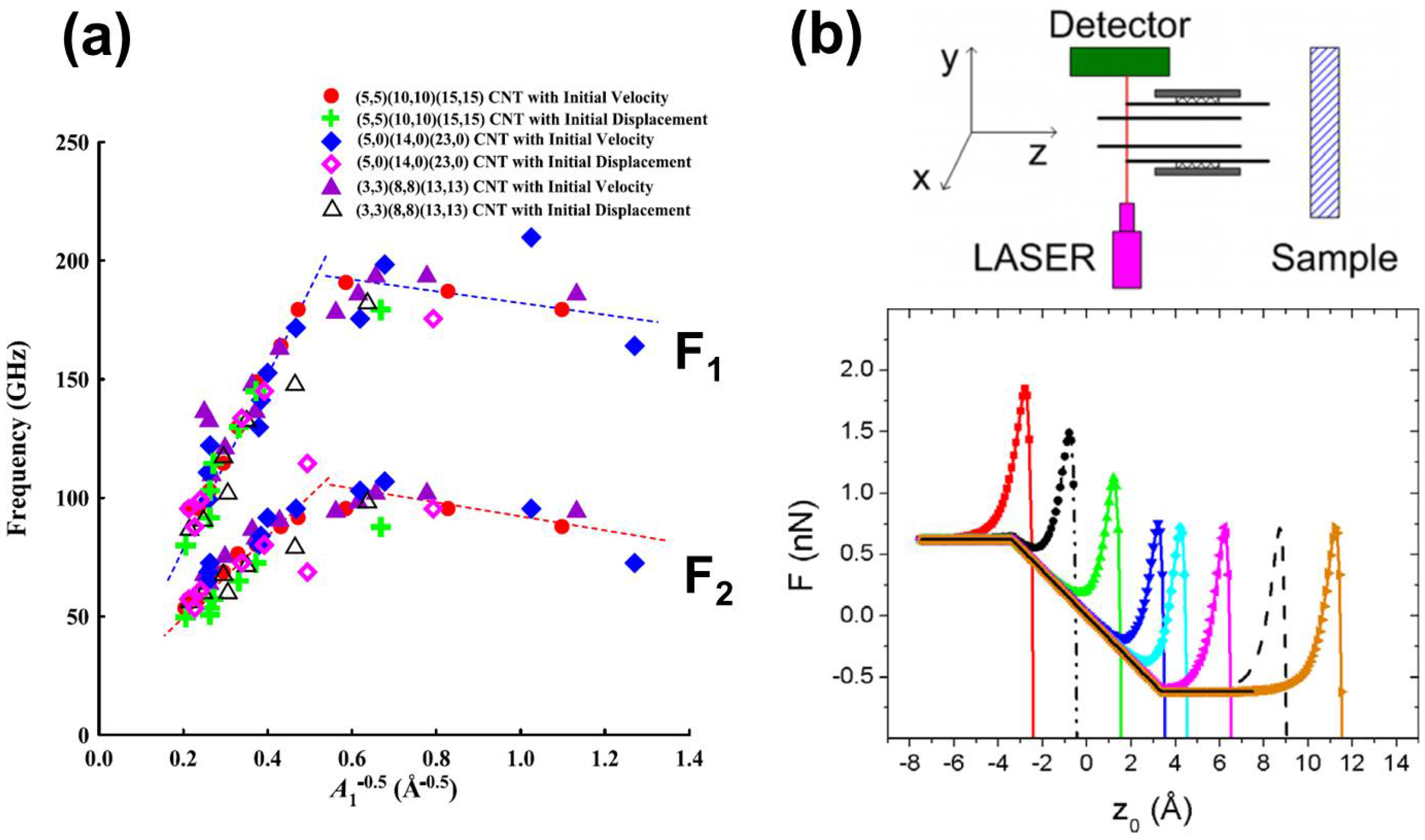 (a) The primary () and the secondary () frequencies of a TWNT oscillator plotted against the oscillation amplitude () related to [168]. (b) The top panel shows the design of an atomic force microspe (AFM) system in which DWNTs would be used as surface probes. The bottom panel shows the intensity of the force between the inner tube of the DWNT and the sample plotted against the distance between the surface and the edge of the outer tube of the DWNT. The free oscillations of the DWNT system have a constant intensity around 0.62 nN, and as the DWNT starts interacting with the sample, a region of a linear force regime dominates [169].