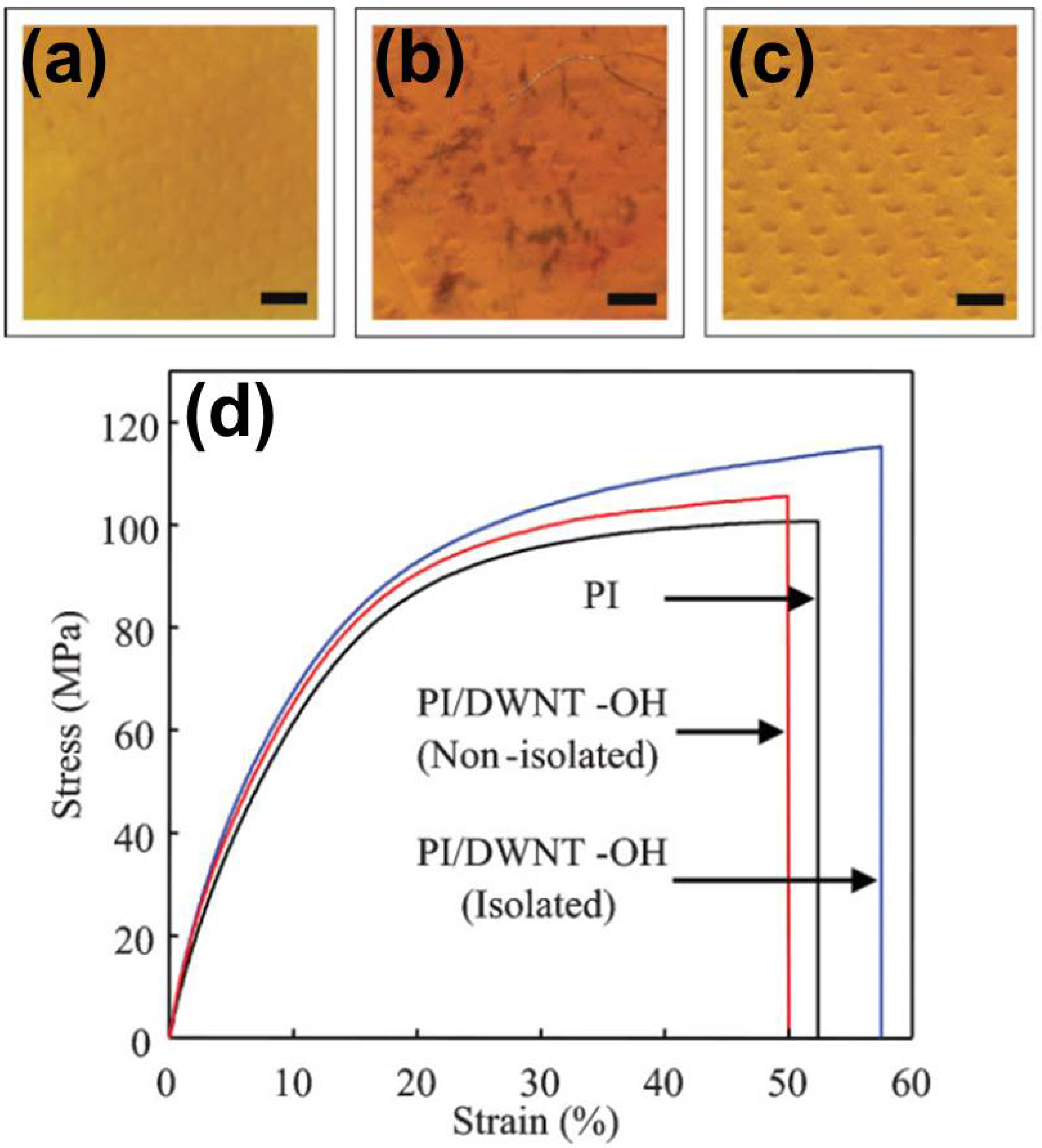 (a) Pure polyimide (PI) film, (b) polyimide/non-isolated DWNTs (PI/DWNT-OH non-isolated) film and (c) polyimide/isolated DWNTs (PI/DWNT-OH isolated) film. The non-isolated DWNTs perturb the transparency of the film. (d) Stress-strain curves of PI (black solid curve), PI/DWNT-OH non-isolated (red solid curve) and PI/DWNT-OH isolated (blue solid curve) . Reproduce with permission from [162], Copyright John Wiley and Sons, 2008.