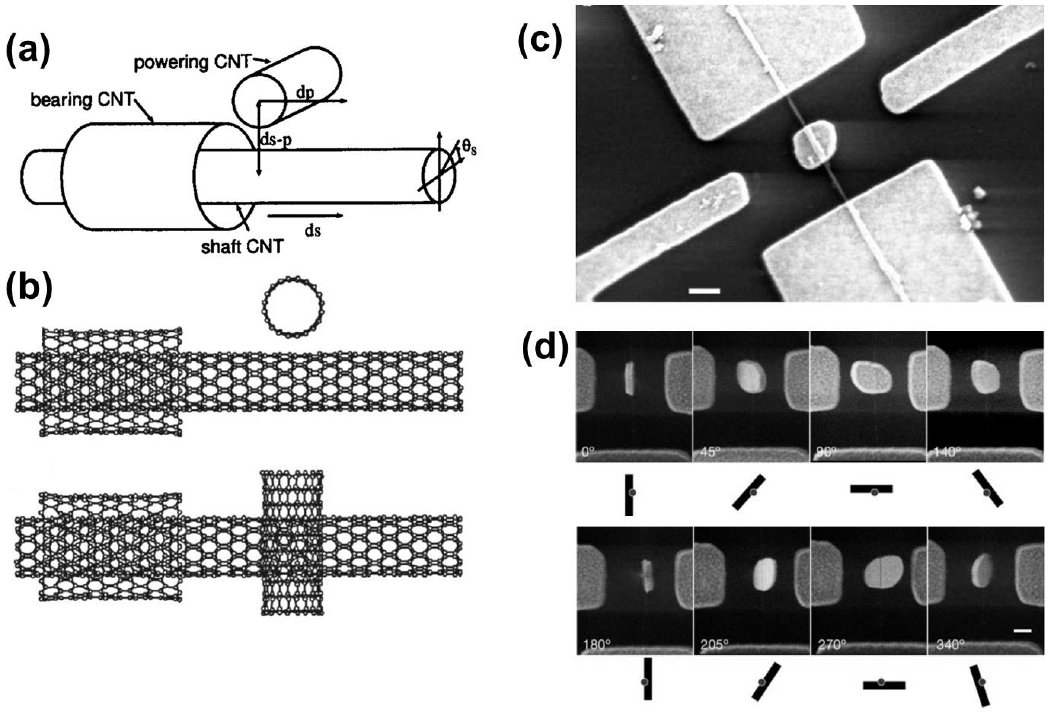 (a) The design of a nanomotor fabricated with one DWNT and one SWNT, which are mechanically coupled to each other. Reproduced with permission from [176], Copyright AIP Publishing LLC, 2008. (b) The side and top views of the nanomotor, respectively. Reproduced with permission from [176], Copyright AIP Publishing LLC, 2008. (c) SEM image of a nanomotor fabricated with a plate attached to the outer SWNT constituting a DWNT. Reproduced with permission from [177], Copyright Nature Publishing Group, 2003. (d) The plate at various angular positions (from 0–340 ). Reproduced with permission from [177], Copyright Nature Publishing Group, 2003.