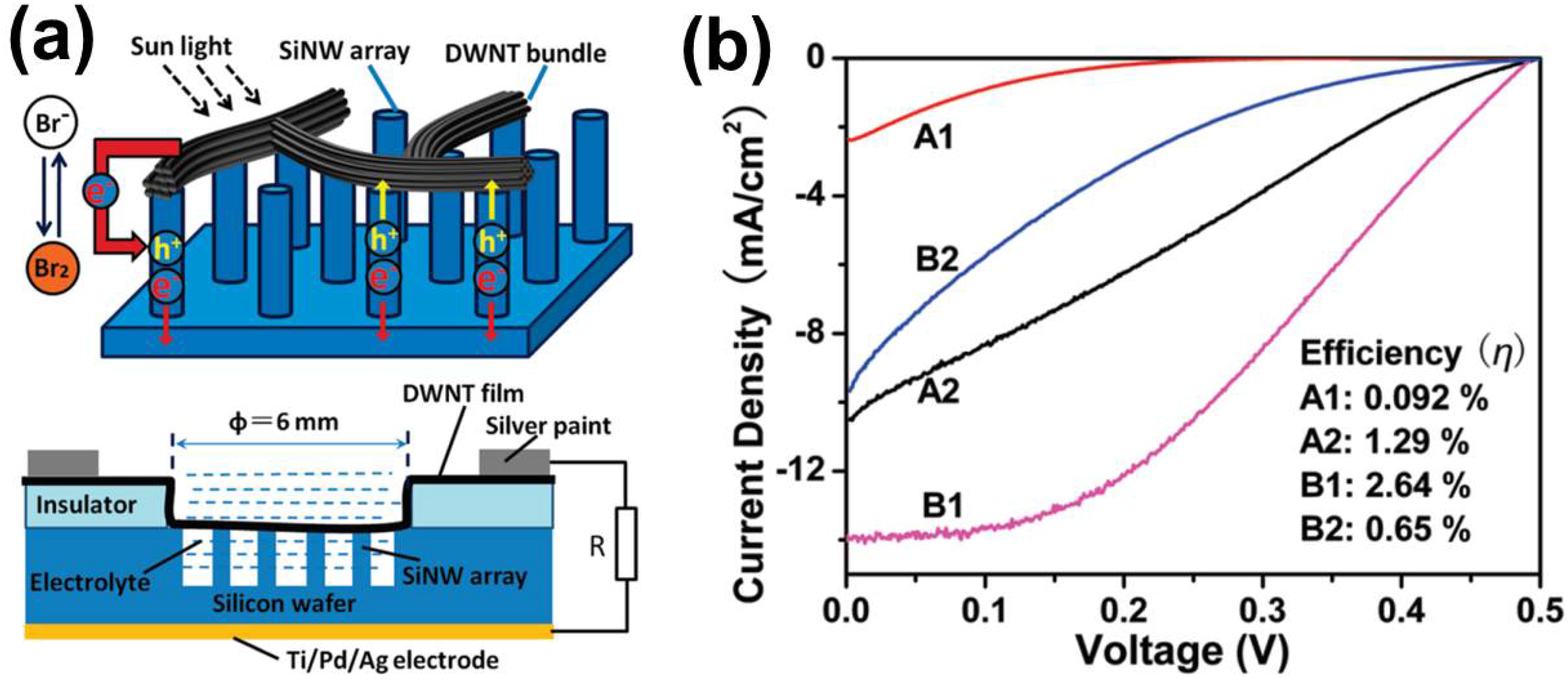 (a) Schematics and side view of a hybrid heterojunction/photoelectrochemical cell (PEC) solar cell fabricated with silicon nanowire (SiNW) arrays and DWNT films. Reproduced with permission from [188], Copyright American Chemical Society, 2009. (b) The current density is plotted against voltage for several samples prepared in different ways: Sample A1 (SiNW/DWNT heterojunction without redox electrolyte), Sample A2 (SiNW/DWNT heterojunction with redox electrolyte), Sample B1 (Si wafer/DWNT heterojunction without redox electrolyte) and Sample B2 (Si wafer/DWNT heterojunction with redox electrolyte). The inset brings the efficiency obtained for each sample. The redox electrolyte improves the efficiency in SiNW/DWNT-based devices, but worsens the efficiency in Si wafer/DWNT-based devices. Reproduced with permission from [188], Copyright American Chemical Society, 2009.