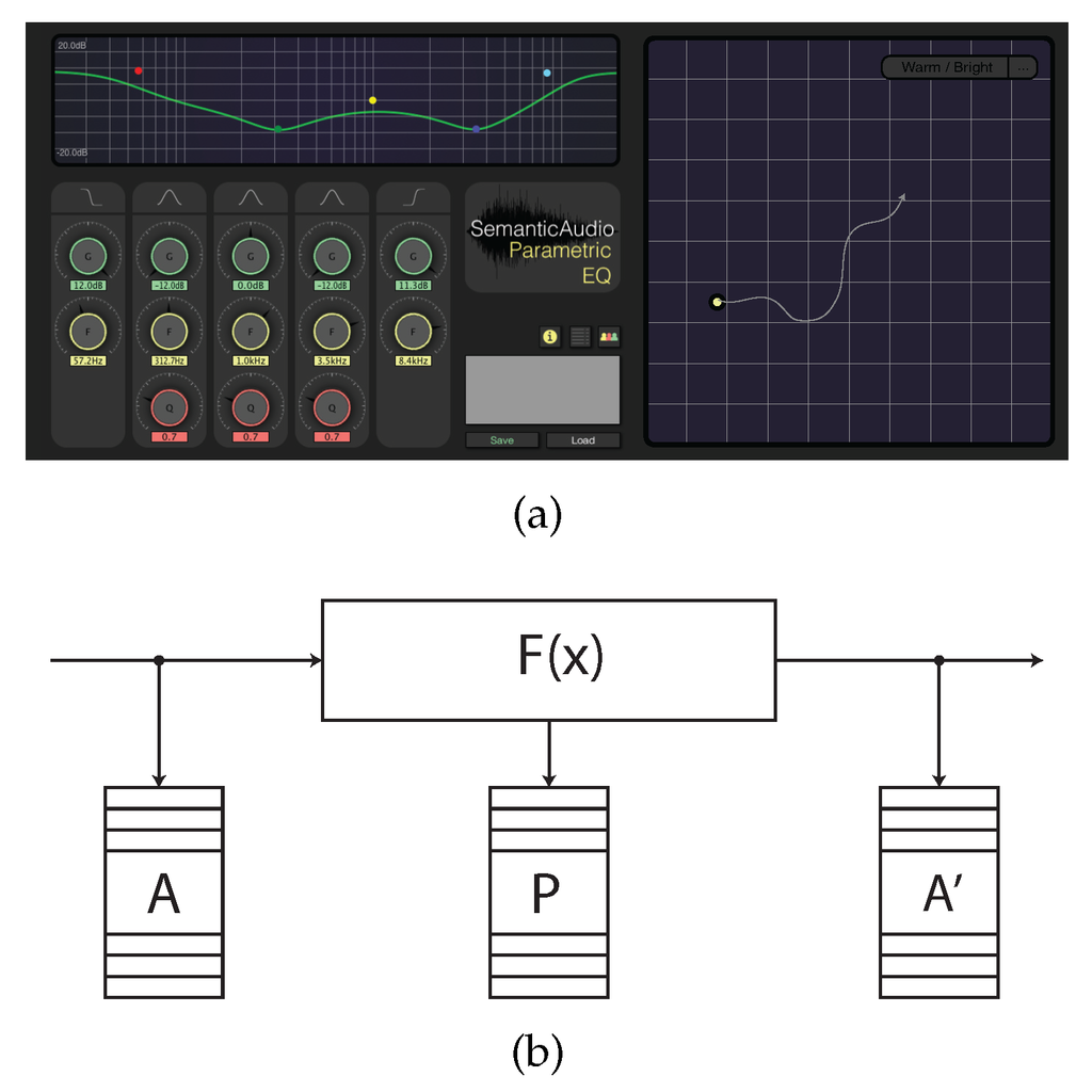 An overview of the Semantic Audio Feature Extraction (SAFE) equaliser and its feature extraction architecture. (a) The extended Semantic Audio Equalisation plug-in with the two-dimensional interface. To modify the brightness/warmth of an audio signal, a point is positioned in two-dimensional space; (b) The SAFE feature extraction process, where A represents the audio features captured before the effect is applied, represents the features captured after the effect is applied, and P represents the parameter vector.