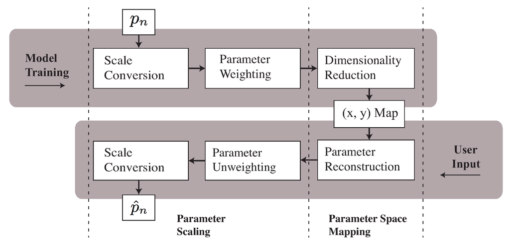 In order to model the desired relationship between the two parameter spaces, a number of problems must be addressed. Firstly, the data reduction process should account for maximal variance in high-dimensional space without bias towards a smaller subset of the equaliser parameters. Similarly, we should be able to map to the high-dimensional space with minimal reconstruction error, given a new set of (x, y) coordinates. This process of mapping between spaces is nontrivial, due to loss of information in the reconstruction process. Furthermore, the low-dimensional parameter space should be configured in a way that preserves an underlying timbral characteristic in the data, thus allowing a user to transform the incoming audio signal in a musically meaningful way. Finally, the process of parameter space modification should not be agnostic of the incoming audio signal, meaning that any mapping between the two-dimensional plane and the equaliser parameters should be expressed as a function of the (x, y) coordinates and some representation of the signal spectral energy. In addition to this, the system should be capable of running in near-real time, enabling its use in a DAW environment.