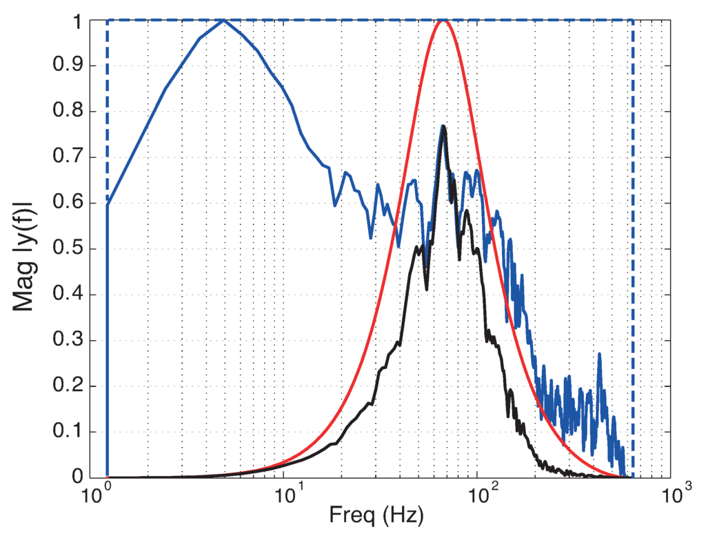 An example spectrum taken from an input example, weighted by the biquad coefficients, where the red line represents a peaking filter, the black line represents the biquad-filtered spectrum, and the blue line represents the spectral energy in the rectangular window ().