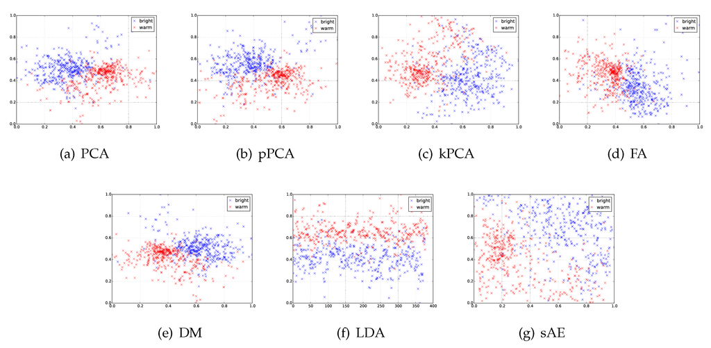 Two-dimensional parameter-space representations using seven data reduction techniques, where the red data points are taken from parameter spaces described as bright and the blue points are described as warm. (a), (c), (f), and (g). PCA: Principal Components Analysis; pPCA: Probabilistic PCA; kPCA: Kernel PCA; FA: Factor Analysis; DM: Diffusion Maps; LDA: Linear Discriminant Analysis; sAE: stacked-autoencoder.