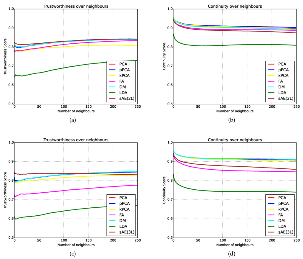 Trustworthiness and continuity metrics were used with a varying number of neighbours, ranging from 1 to 250. Here, the sAE exhibits higher scores for a lower number of neighbours (<120), as shown in Figure 5a—a result that suggests the system is better at retaining the local structure of the data, which is a necessary goal for a successful mapping technique. Furthermore, while the continuity score of the autoencoder is lower than the remaining dimensionality reduction techniques (Table 2), its error from the best performing technique in terms of continuity (kPCA) is only 0.015, which is deemed negligible.
