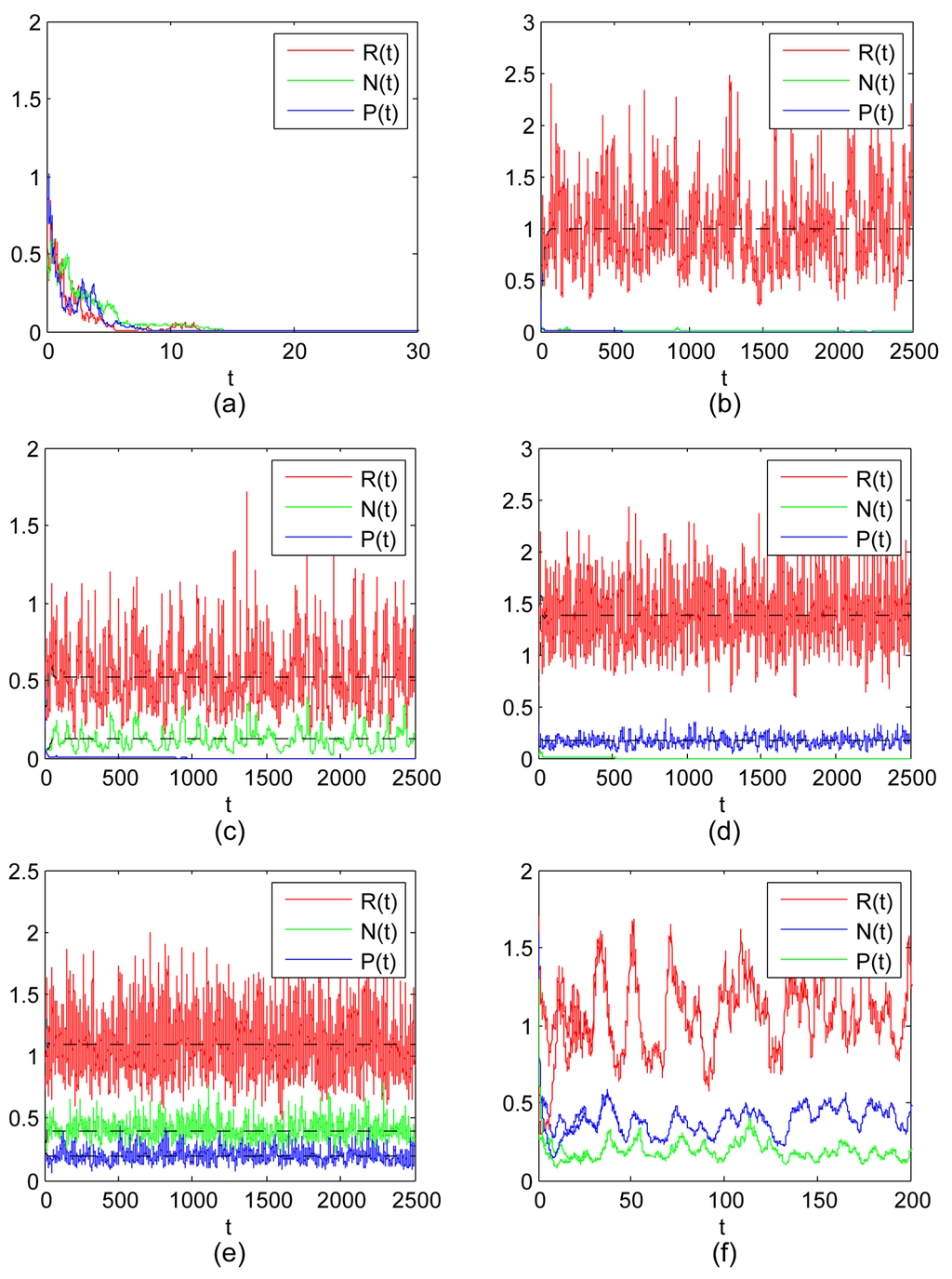 Figure 1. (a) = 0.9177, = 0.4472, = 0.6325, 0.8 = 2r < = 0.8422; (b) = 0.7750, = 0.6325, = 0.5477, = > 1 > = 0.9991, = , ; (c) = 0.7746, = 0.1414, = 0.1414, L= 0.1790, = 1.2088 > 1 and = = 0.0501, and ; (d) = 0.6, = 0.8, = 0.4, = 1.2 > 1 and = < = 0.0862, and ; (e) , and ; (f) = 0.7746, = 0.1414, = 0.2449, (0) = 1.7, (0) = 0.6, (0) = 0.3, (0) = 0.7, (0) = 1.6, (0) = 1.3. Here r = 0.4, = 0.1, = 0.2, = 0.1, = 0.4, = 0.5, = 0.75, = 0.4, = 0.3, = 0.6, = 0.5, = 0.8. - The existence of both the shared prey and IG prey with the extinction of IG predators, and the existence of both the shared prey and IG predators with the extinction of IG prey are both possible outcomes of the stochastic model (3) with different sets of parameters (see Figure 1c,d). Here, it is worth noting that the noise has a negative effect for IG prey and IG predators, and may also have a positive effect for the shared prey if the values of and grow larger (see (iii) and (iv) of Theorem 8). This also implies that stochastic fluctuation of N or P would help R to grow larger;