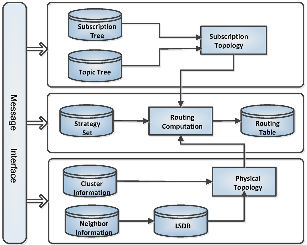 As depicted in Figure 2, we devise a strategy-driven topic tree aggregation routing schema. From the subscription list and topic tree, we extract the subscription topology in incremental storage mode. From link state database(LSDB) and cluster information, we extract the cluster-level physical topology. Then, we compute multicast routing paths per topic based on the subscription topology and cluster-level physical topology, as well as the strategy base in our schema.