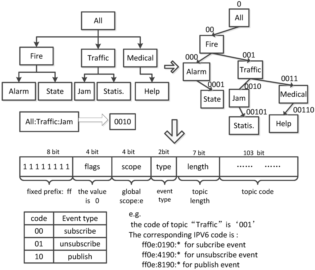 For a topic t p i , there are three kinds of events: publish events, subscribe events and unsubscribe events. Subscribe and unsubscribe events should be broadcast to all of the nodes. Therefore, flooding is an appropriate method. Publish events should be routed to those subscribers who have subscribed to them beforehand. SDN-configurable switches must identify these three types of events so that they can perform different processing. For this purpose, we encode event type simultaneously. Two-bit binary coding meets this requirement. This two-bit type code for events is stitched with t p i , forming the identifier (called typetp) of a topic t p i . When an event is generated, the typetp is enclosed in its packet header. It is noteworthy that the subspace relationship mentioned above allows the events whose topics have the cover relation to share a common subpath. Recall that the routing of a publish/subscribe system is an obvious multicast problem, so we adopt the IPV6 multicast address to embed typetp. Figure 3 describes this process.
