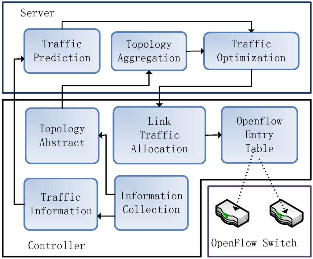 We design traffic engineering for our system to achieve approximate optimal performance. All of the functions are deployed on the server and controllers. The server accounts for seeking optimized routing paths among clusters while controllers split flows among multiple paths to balance traffic. Figure 4 shows an overview of the traffic engineering architecture.