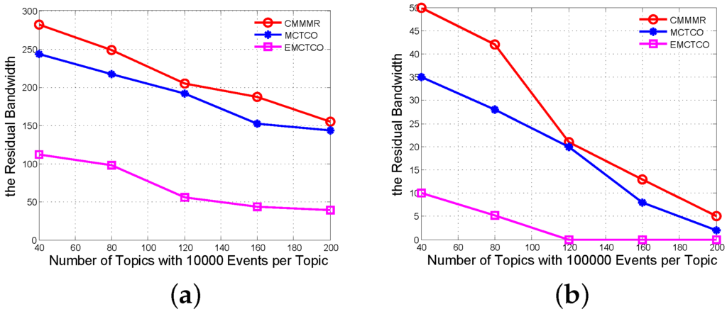 Figure 8. The residual bandwidth. (a) 10,000 events per topic; (b) 100,000 events per topic.