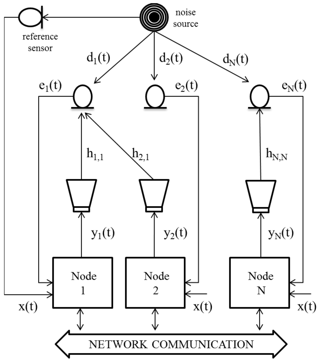 Consider a network of N nodes that supports an ANC system composed by N sensors and N actuators, as shown in Figure 2. For the sake of simplicity, we consider one disturbance noise and a distributed network of single-channel acoustic nodes in a homogeneous network. This implies that all the nodes have the same computation and communication capabilities, execute the same algorithm and are composed of a single sensor and a single actuator. The signals recorded at the sensors are called error signals and denoted by (where ), the actuators emit the filter output signals (where ), the acoustic channel impulse response between actuator j and sensor k is estimated as , which is defined as the Finite Impulse Response (FIR) filter that models the estimation of the real acoustic channel . In feedforward systems, the reference signal , is captured by a reference sensor employed to detect the acoustic noise far away from the area of interest. There exits only one noise source and all the nodes share the same reference signal . We aim at canceling the acoustic noise signal in the sensors location, , designing an adaptive filter at every node. Assuming that varies slowly, it can be written: