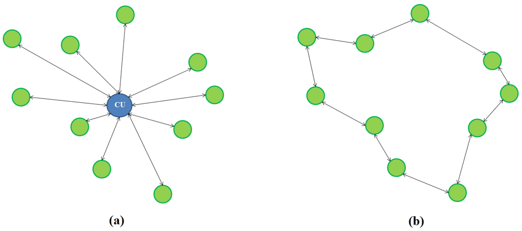 A centralized ASN (a) and distributed ASN (b). CU is the central unit in the centralized case.