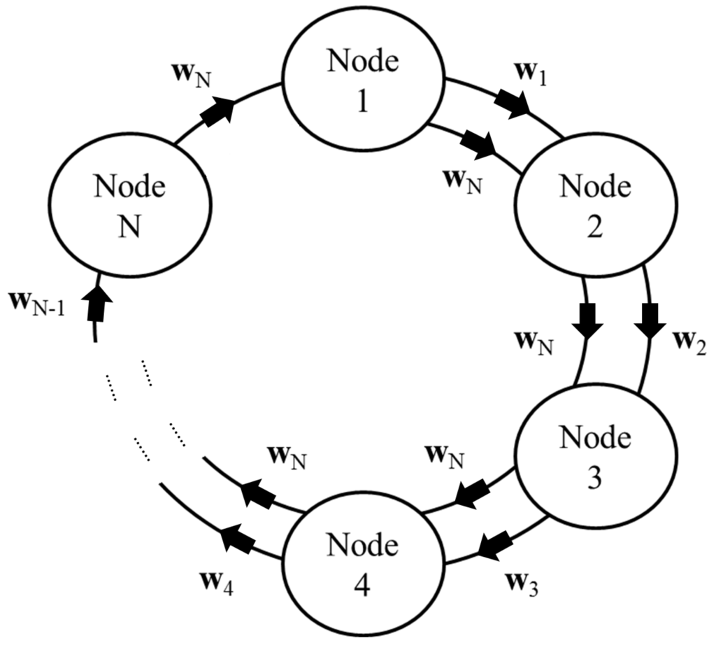 In the case of a ring network based on an incremental strategy, the coefficients of the adaptive filters are calculated by distributing the calculation among different nodes by transmitting information to an adjacent node in a consecutive order. Thus, every node can calculate a portion of the sum of the filter updating equation and supply to the next node the partial result to update the coefficients with its respective information. If this step is performed with an incremental strategy, the last node will have the complete updated coefficients. Finally, these coefficients are disseminated to the rest of the nodes to allow the system to generate the appropriate cancelation signals before the next iteration begins. This means interchanges of the filter coefficients among the nodes (see Figure 4). Every kth node can share information with its adjacent th node. Each node should calculate the adaptive filters of all the nodes of the network so, in a network of N nodes, the network state would be defined by N adaptive filters one of each node. If we define the global state of the network as the adaptive filter coefficients of each node of the network at the time instant t and considering a local version of at the kth node, Equation (6) may be written as: