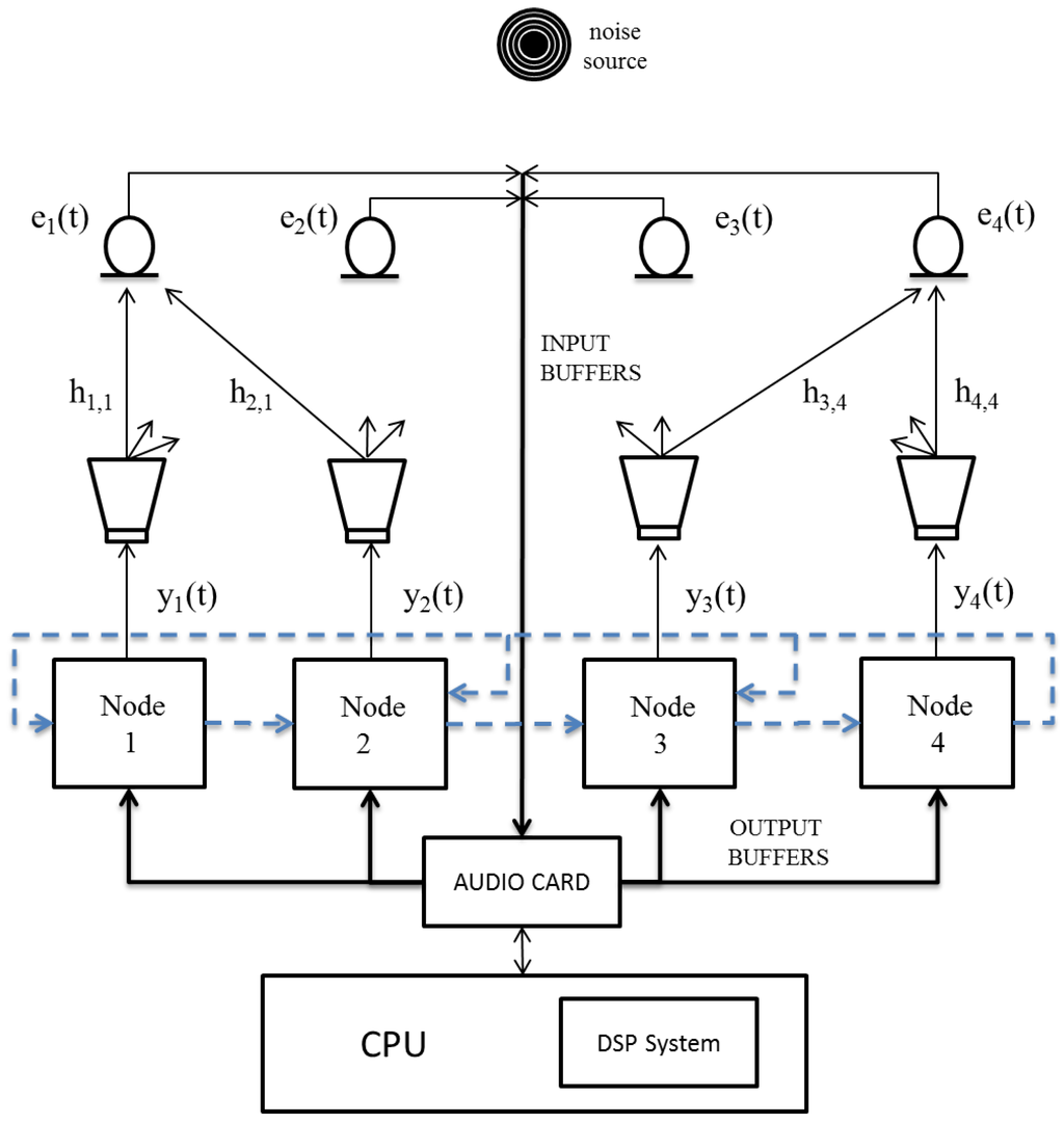 The distributed ANC prototype is depicted in Figure 5. The addition of the recent DSP System Toolbox [27] in the computing environment MATLAB® provides multichannel real-time audio recording, processing and reproduction at low latency. Audio objects based on Object Oriented Programming (OOP) have been optimized for iterative computations that process large streams of audio data. Moreover, Audio Stream Input/Output (ASIO) drivers [28] have been incorporated to this software providing a low-latency and high fidelity interface between MATLAB® and audio card. The hardware implementation is composed by a CPU (Intel Core i7 3.07 GHz) and an audio card (MOTU 24 I/O). The communication between both components is performed by ASIO drivers and it is controlled by using the MATLAB® System objects provided by the DSP System Toolbox of MATLAB® software. The audio card stores the input data from the sensor of each node in buffers of size B and send them to the CPU through the ASIO drivers. The CPU, with MATLAB® support, executes the audio processing, saves the output data in buffers and sends them back to the audio card through the ASIO drivers, to be reproduced by the loudspeaker of each node.