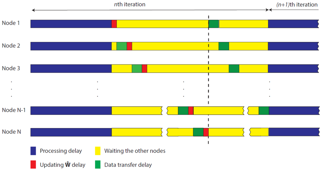 Timing diagram of the processes carried out by each node of the network at each block iteration.