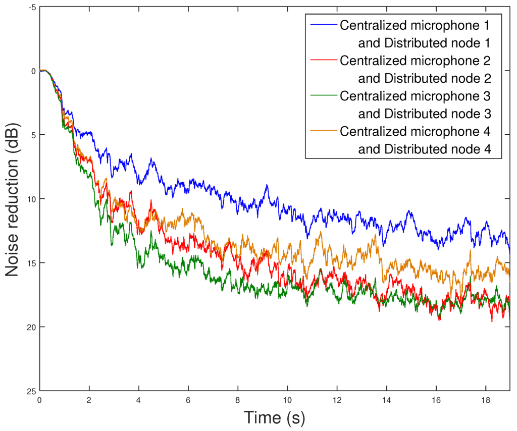 In the first scenario, we have evaluated the performance of both the distributed and the centralized FPBFxLMS algorithm in a network composed of four single-channel nodes with no communications constraints. Figure 8 shows the by using Equation (12) for both algorithms. As expected, the distributed implementation exhibits the same performance than the centralized implementation for the four nodes. Both algorithms show a robust and stable performance providing an attenuation up to 11 dB for the worst node and almost 20 dB for the best node.