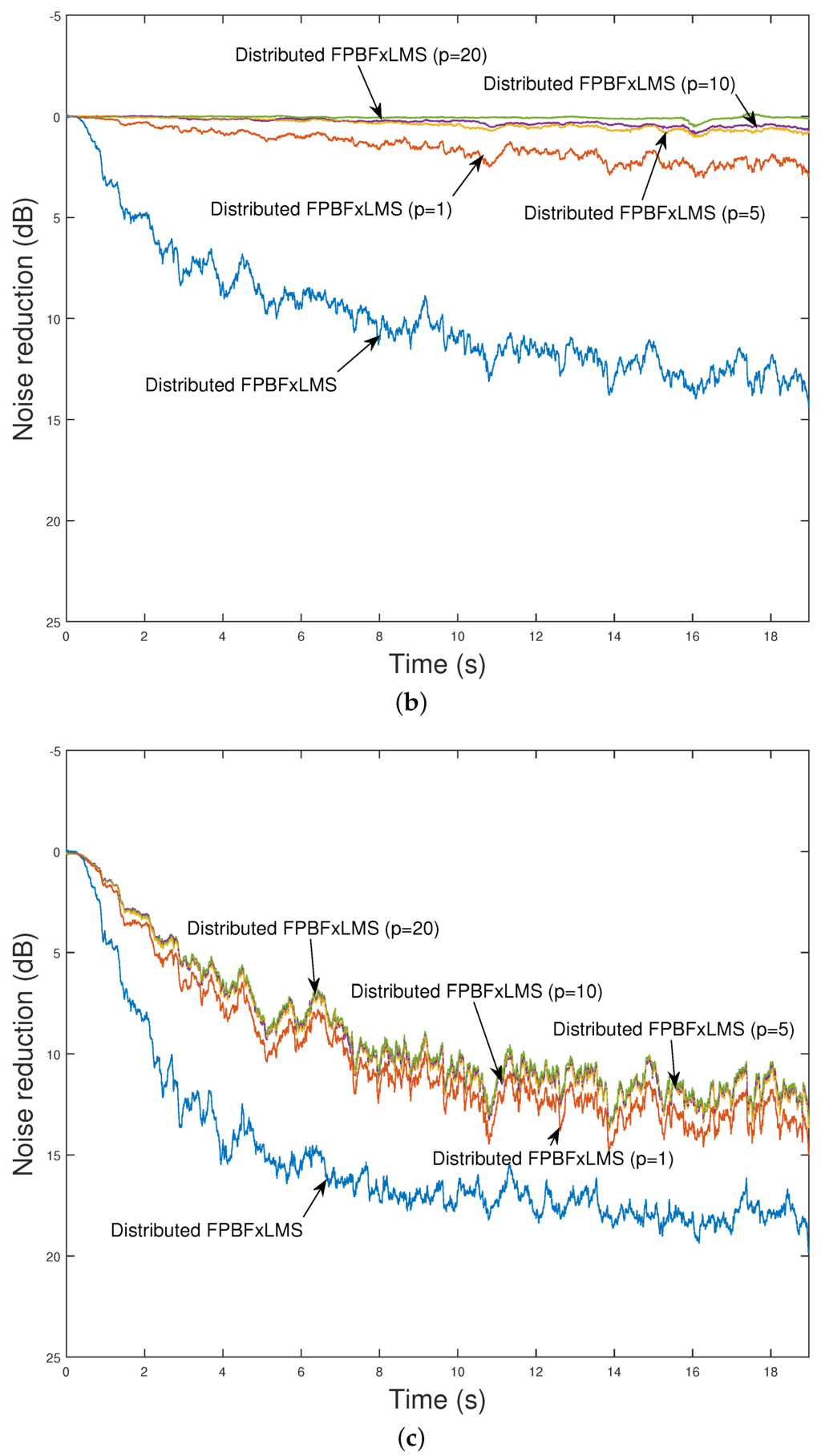 In order to evaluate the performance of the different algorithms, we define the instantaneous Noise Reduction at node k, , as the ratio in dB between the estimated error power with and without the application of the active noise controller: