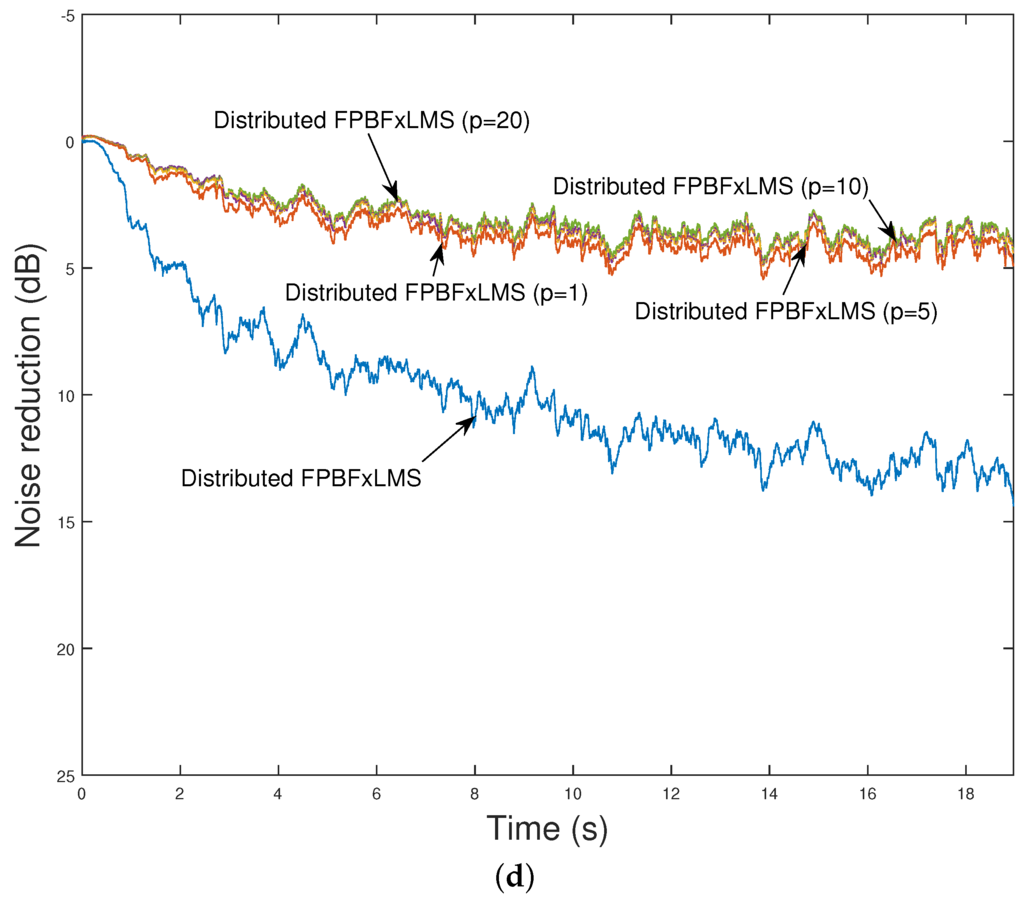 In the second scenario, the influence of a constant delay between information exchanges within a four-node network on the behavior of the distributed FPBFxLMS algorithm has been evaluated. The curves of the best node in the network with different delay values of p are presented in Figure 9a for case 1 and Figure 9c for case 2. In both cases, as p increases, the performance of the algorithm gets worse. However, when the nodes performs their local updating while waiting for the network information (case 2), the influence of the increased delay is lower than in case 1, obtaining an in all cases only 5 dB lower than the case of an ideal network. Similar results are obtained for the node with the worst performance. Figure 9 shows the curves of the worst node in the network with different values of p, (b) for the case 1 and (d) for the case 2. Therefore, for networks with communication constraints, the behavior of the system can be improved if the nodes are allowed to update their filter coefficients while waiting for the network information. It is important to take into account that the final behavior of both cases depends on the degree of acoustic interaction between nodes, and, therefore, it should be studied in future works.