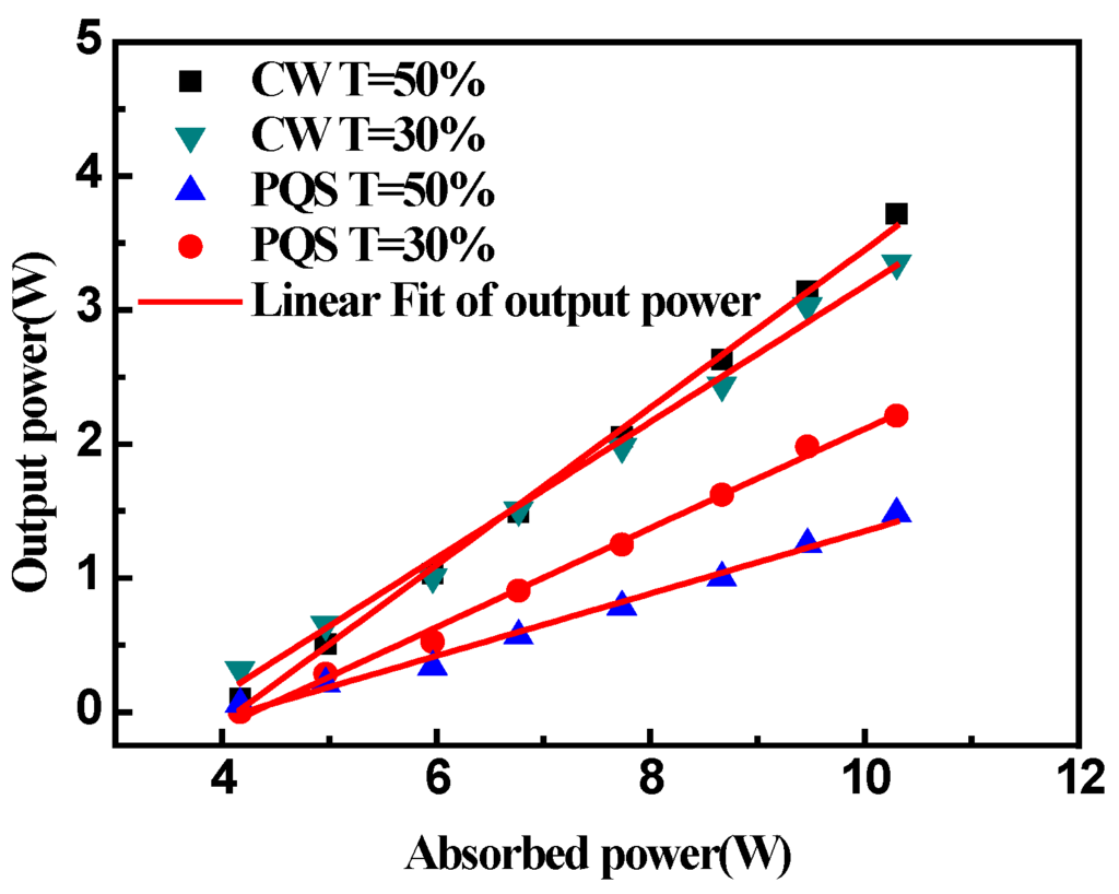 Figure 2 shows the average output powers versus the absorbed pump power. From Figure 2, we can see the average output powers increases as the increase of absorbed pump power. In PQS mode, the maximum average output power of 2.2 W can be obtained by using an output coupler with T = 30% at the absorbed pump power of 9.3 W. The slope efficiency is 12%. For the transmission of 50%, the slope efficiency is 9% with the maximum average output power of 1.5 W. In the continuous wave (CW) mode, the maximum output powers change to 3.35 W and 3.72 W, with the output couplers of T = 30% and T = 50%, respectively. The slope efficiencies are 17% and 20%. This is because the increase of pumping power will result in the increase of the ratio of the initial and threshold inversed population. The average output power and the efficiency of the Q-switched laser were lower than that in the CW mode, which could be attributed to the intra-cavity loss caused by inserting graphene for the Q-switched laser. The measured slope efficiency is well below the quantum efficiency. We attribute this to the low absorptivity of Ho crystal. Other factors that should be considered are difficulties with accurate mode matching between the pumping beam and oscillation beam.