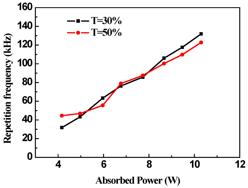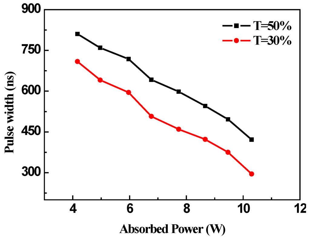 The variation of the pulse width and the repetition frequency versus the absorbed pump power under different transmissions of output coupler are shown in Figure 3 and Figure 4, respectively. From Figure 3, we can see that all the pulse width decreases with the increase of the pumping power. For the two different output couplers of T = 30% and T = 50%, the pulse widths decrease from 709.1 to 295.2 ns, from 810.5 to 421.5 ns, respectively. We attribute this pulse shortening to the larger gain of the resonator when the transmission of the output coupler is low. Low output coupler transmission is usually beneficial to the energy storage and to realize the pulsed laser easily, further improving the pulse energy and reducing the pulse duration of Q-switched laser. The population stored in the upper-level manifold became large under the low Q value of the resonator. When the graphene became bleached, the resonator was under a high Q value, the photon in the resonator appeared to increase rapidly at a shorter time that produced a narrower pulse duration with a slight change of the pump power.