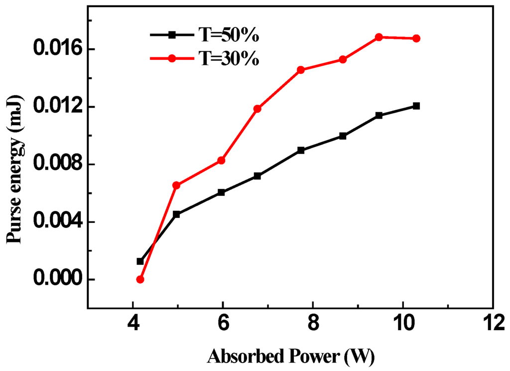As for the repetition frequency, we can see from Figure 4 that they all increase with the augment of the pump power. For the T = 30% and T = 50%, the pulse repetition frequency (PRF) grows with the pump power from 31.8 to 131.6 kHz, from 44.6 to 122.7 kHz, respectively. Moreover, we can find that the pulse width and pulse repetition frequency of Ho:YVO4 laser can be controlled by choosing an output coupler and changing the pump power through the analysis. According to the data of average output power and pulse repetition, we can calculate the pulse energy, which is shown in Figure 5. As we can see, the maximum output pulse energy is 16.8 µJ for 117.6 kHz repetition rate with T = 30%. The highest single-pulse energy shows at 9 W, which is not the highest absorbed power. We attribute this to the damage of the graphene and the unwanted heating of the SA by the residual pump, since the graphene was not attached to a cooler. The improvement of the pulse train and the pulse energy and reducing the pulse duration of Q-switched laser should be achievable by optimizing layer number of graphene and transmission coefficient of the output coupler.