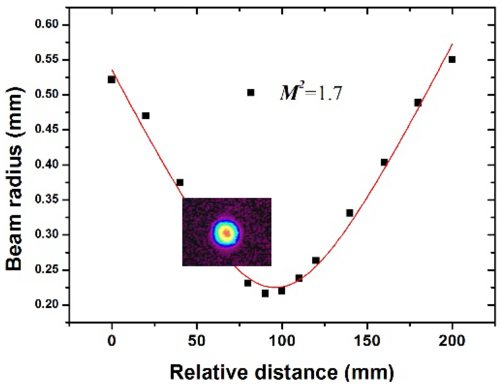 The far field beam profile and the result of M2 measurement. (Inset: typical two-dimensional beam profiles).