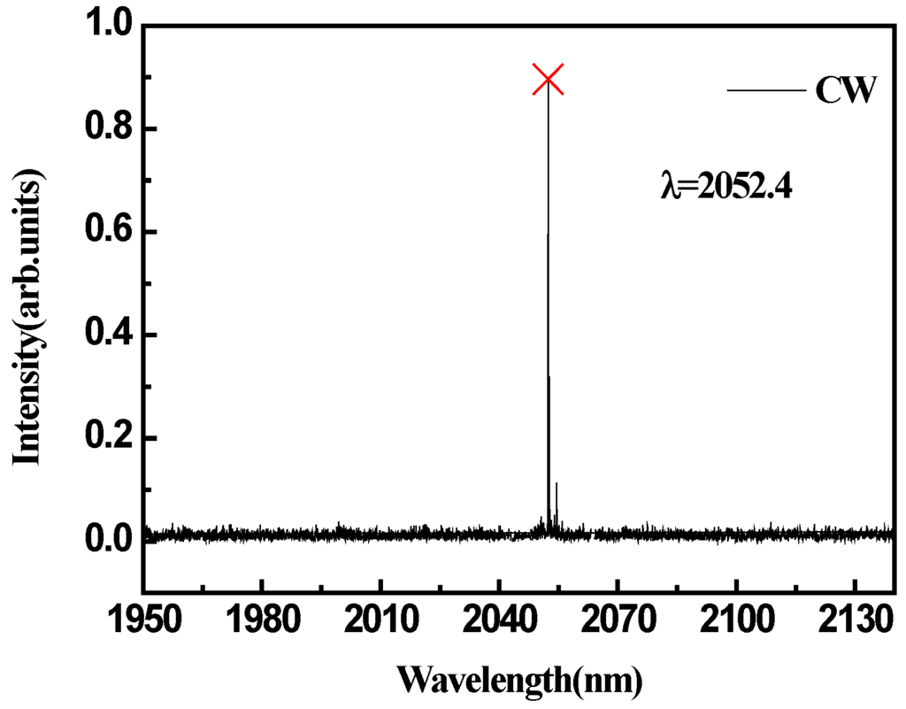 To determine the beam-propagation factor (M2), we routed the Ho laser’s radiation through a 150-mm-focal-length lens and measured the beam radius by using a knife straight edge, which is shown in Figure 8. A typical two-dimensional beam profile is shown in Figure 8 as well. The data were fitted by least-squares analysis to standard mixed-mode Gaussian beam propagation equations. Derived from standard beam-propagation expressions, the fit yields M2 = 1.7. We attribute it to the mode of the pump laser. By using a spectrum analyzer (Bristol Instrument 721A), the output wavelength of Ho:YVO4 laser in both CW and PQS modes were measured with absorbed pump power of 2.2 W and T = 30%, which are shown in Figure 9 and Figure 10. The shift of the central wavelength resulted from the varied resonator loss. The inversion population density was very high when the laser pulse began to build as a result of the intra-cavity losses increased greatly when inserting the graphene SA into the cavity, which resulted in the output central wavelength under the PQS operation blue-shifting relative to the CW operation. While changing the transmission of the output coupler, the wavelength did not change.
