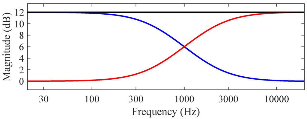 Magnitude responses of a low (blue) and high (red) shelf filter with a 12-dB gain and 1-kHz crossover frequency, and the cascade of the two filters (black).