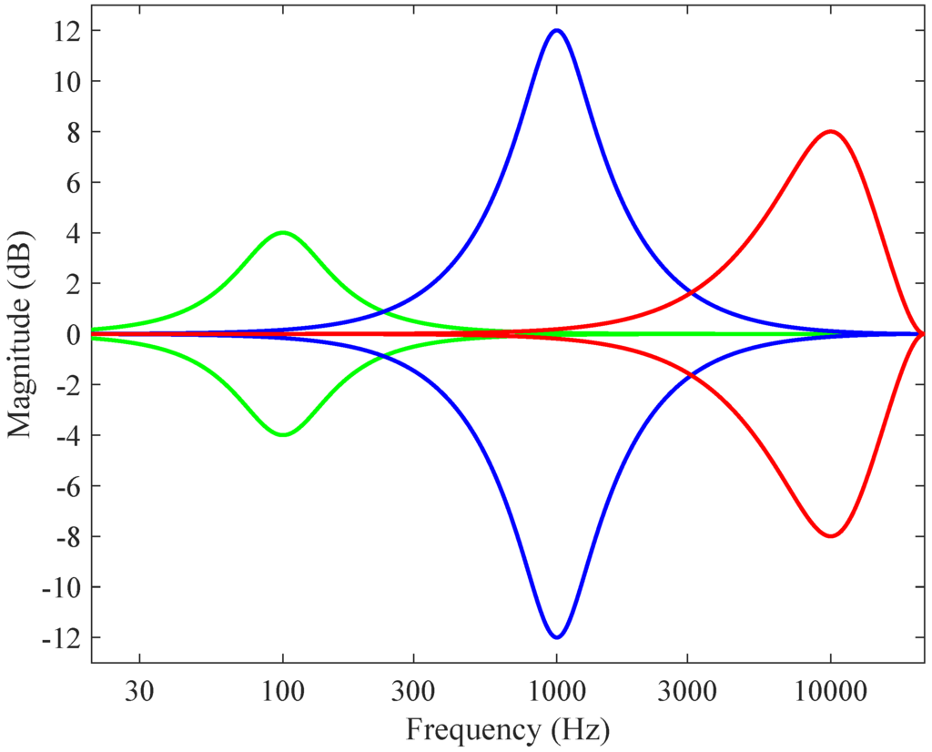 Magnitude responses of peak and notch filters at center frequencies 100 Hz (green), 1000 Hz (blue), and 10,000 Hz (red), when . The gains of the peak and notch filters are complementary, i.e., G and , respectively.