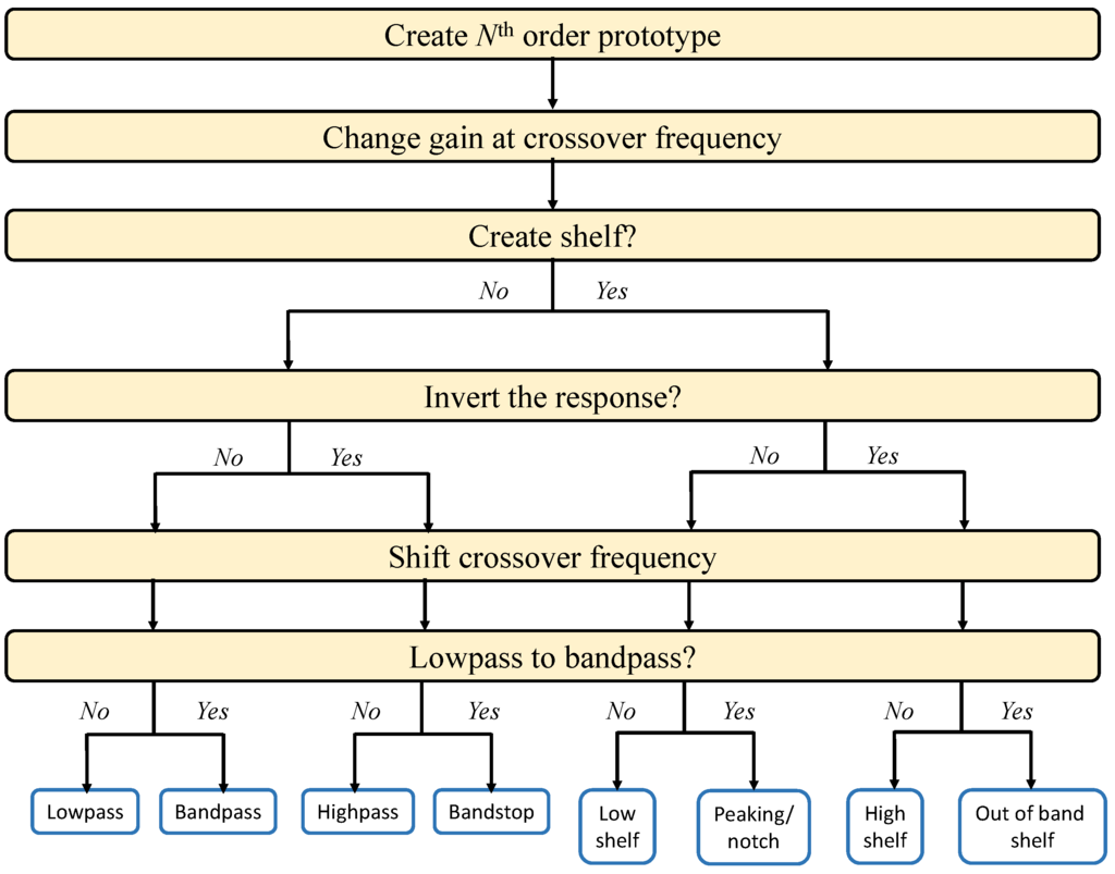 This filter has the same crossover frequency and same behaviour at DC and Nyquist as the first order filter. But now the poles result in a sharper transition at . Then, simple transformations may be applied to each first order section in order to transform this prototype filter into any of the standard designs. The steps to follow in these transformations are depicted in Figure 6.