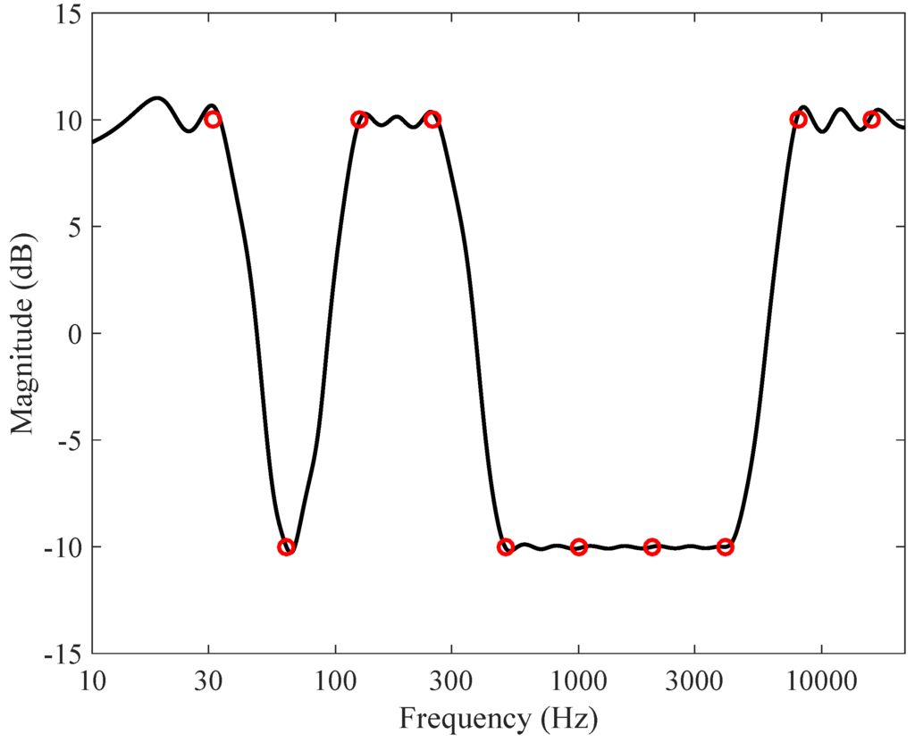 Orfanidis suggested techniques for the design of high order minimum phase filters based on a variety of classic filters: Butterworth, Chebyshev I, Chebyshev II, and elliptic polynomials []. Holters and Zölzer derived high order Butterworth shelving filters []. Fernandez-Vazquez et al. focused on the design of such filters based on a parallel connection of two stable allpass filters []. Särkkä and Huovilainen modeled analog parametric equalizer responses accurately using high order IIR filters []. However, all these high order designs begin with analog prototypes. But it is possible to design high order filters entirely in the digital domain, as described in []. We summarize the digital approach next.