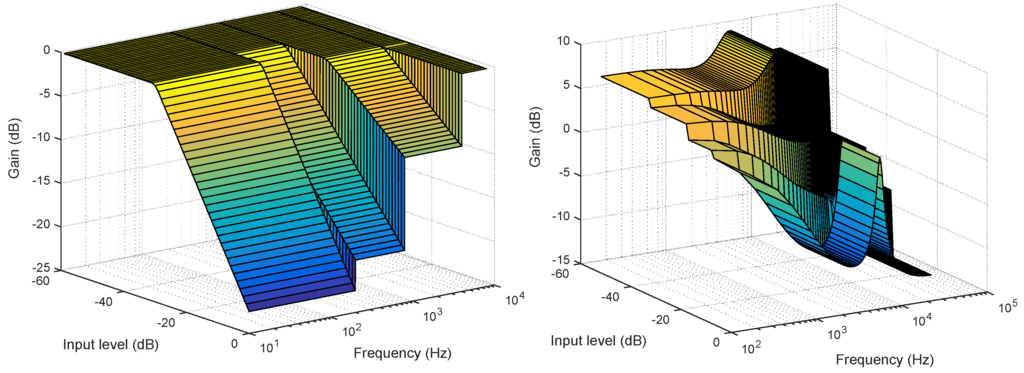 In shelving mode, gain G is applied to all frequencies below or above a crossover frequency . These are called the low shelving and the high shelving filter, respectively, and are sometimes used in the lowest-frequency and highest-frequency bands. These shelving filters are similar to those found in the basic tone control, but where the tone control usually uses first order shelving filters, the parametric equalizer uses either first or second order filters. First order shelving filters are used to create smooth transitions (about 6 dB/octave) between affected and unaffected frequency regions. The crossover frequency is sometimes called the corner, cut-off, or transition frequency, but we prefer to use the term crossover herein.