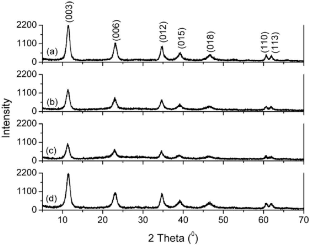 XRD (X-Ray diffraction) patterns of the synthesized layered double hydroxides (LDHs). (a) S–NiMgAl–Mn; (b) S–NiMgAl–Co; (c) S–NiMgAl–Cu and (d) S–NiMgAl–Zn.
