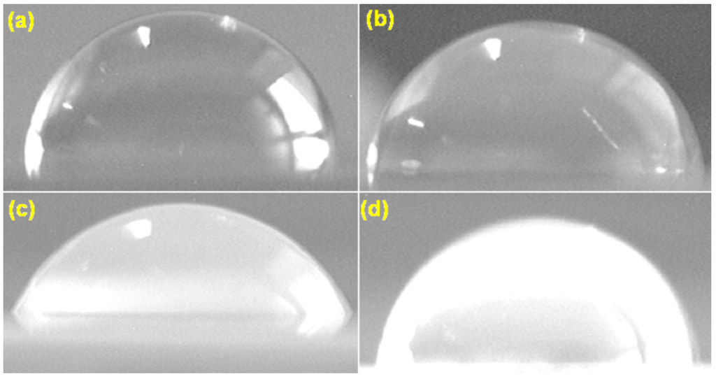 Contact angle images of the synthesized LDHs. (a) S–NiMgAl–Mn, (b) S–NiMgAl–Co, (c) S–NiMgAl–Cu and (d) S–NiMgAl–Zn.